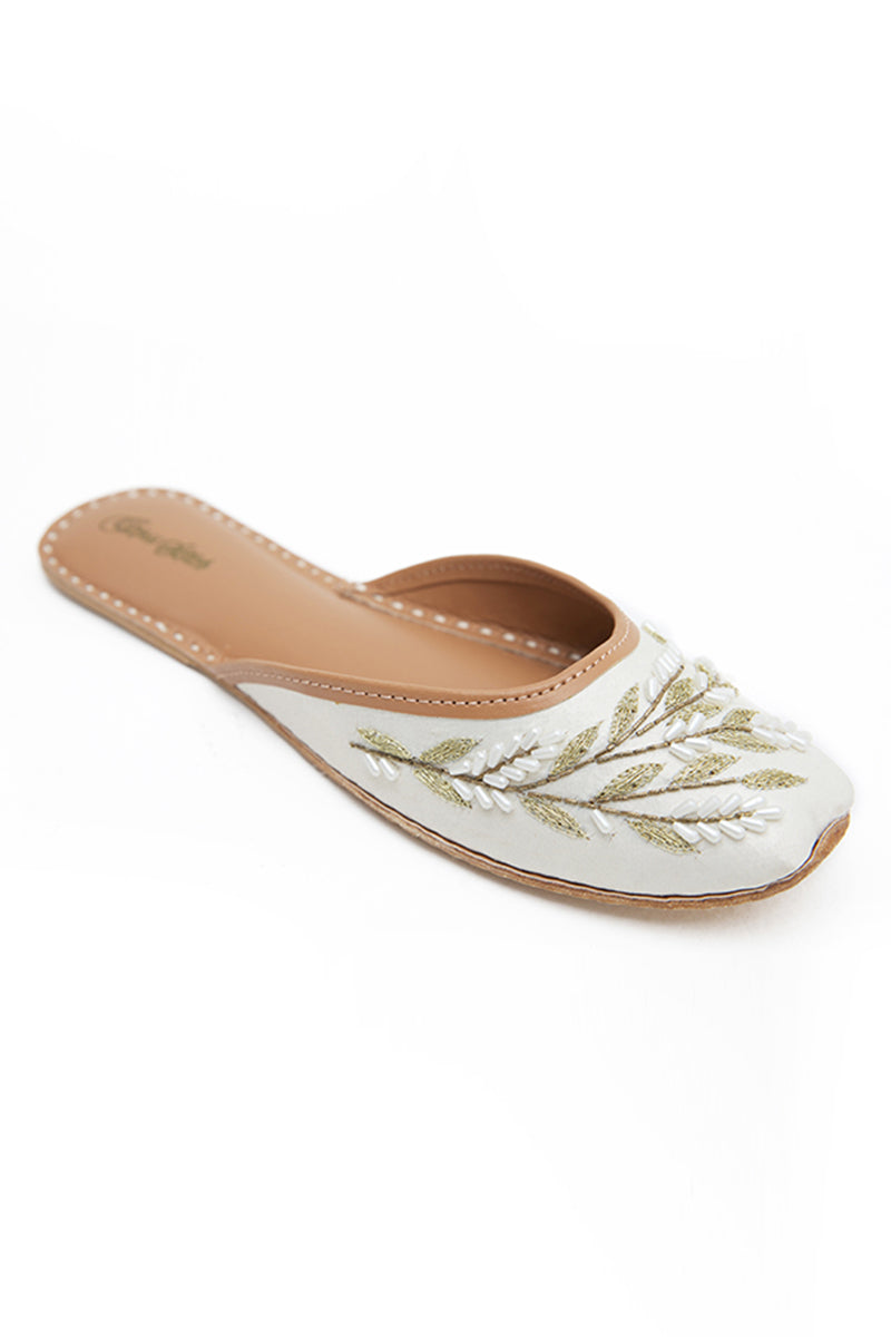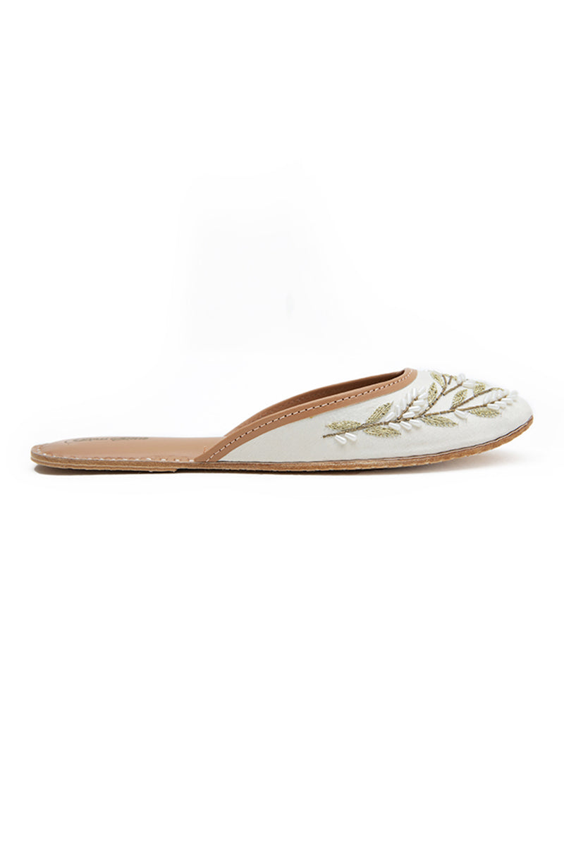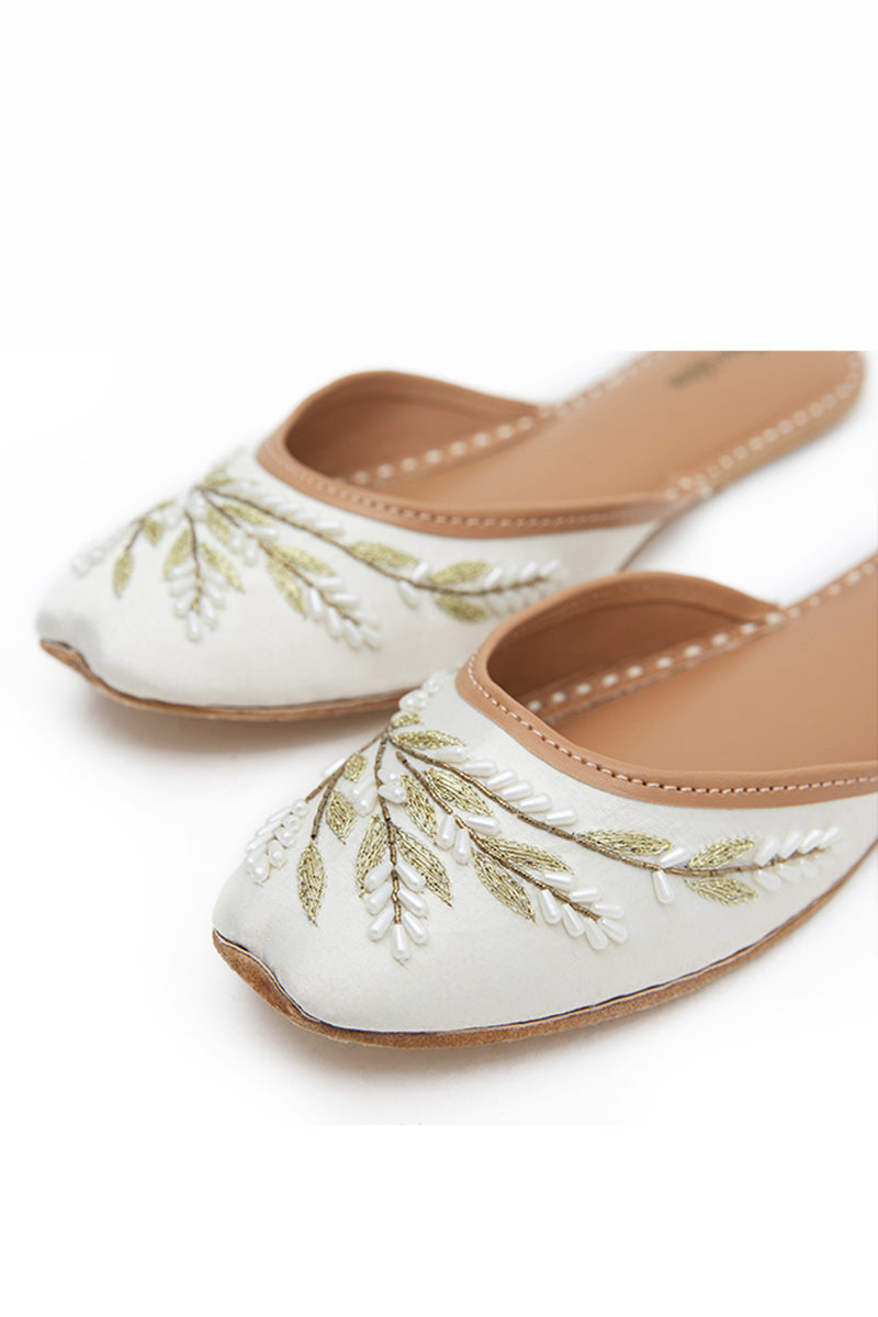 A SOPHISTICATED WHITE CANVAS EMBELLISHED WITH CONTRASTED WHITE PEARLS AT THE FRONT AND A BROWN BASE. THIS GLISTENING KHUSSA IS A STUNNING PIECE TO WEAR DURING THE HOLIDAY SEASON.