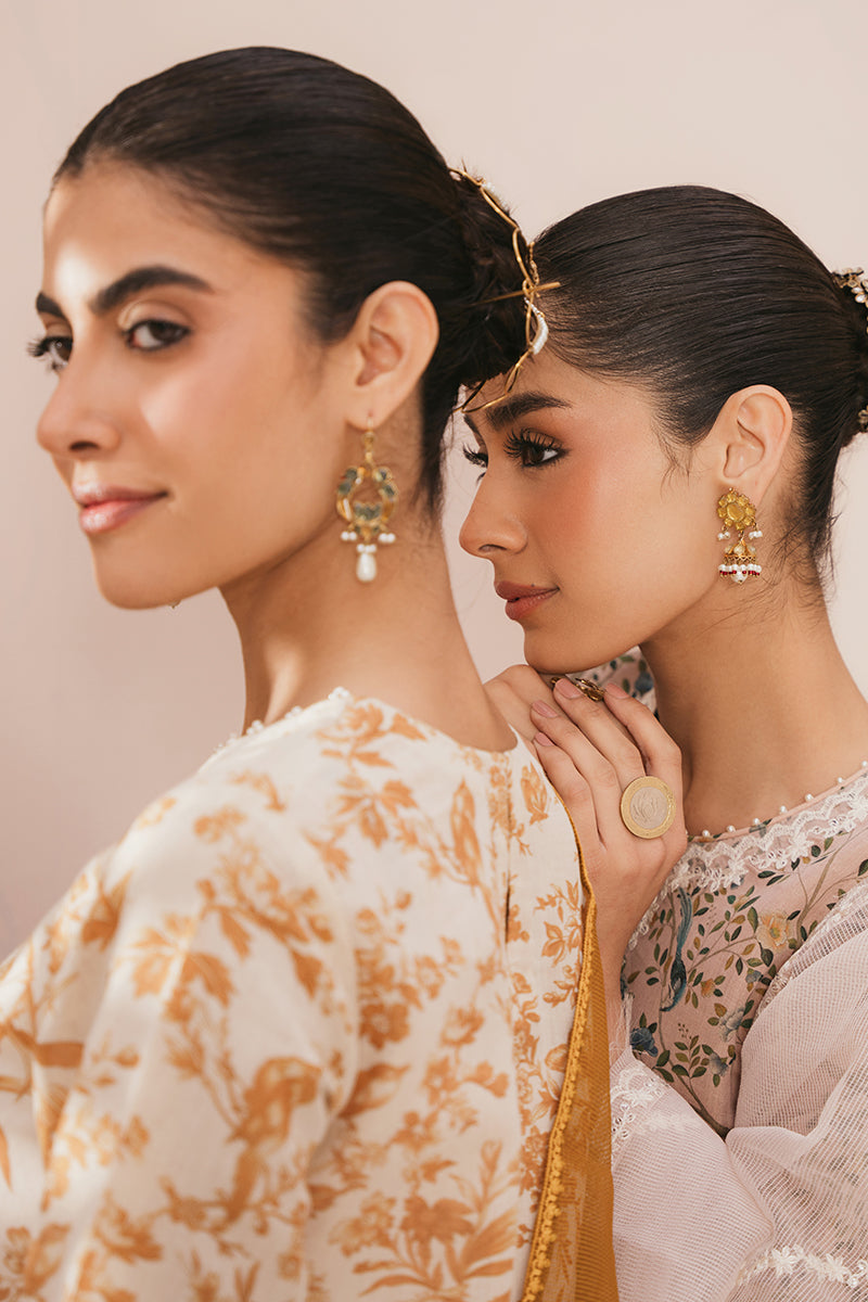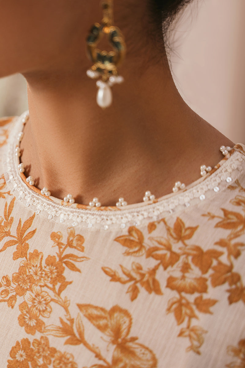- Effortlessly elegant and sophisticated, the RUSSET ZEAL shirt and dupatta set brings together a stylish straight shirt with intricate zari lawn fabric and front/back print, adorned with small round neckline and embroidered pearl details. The straight sleeves feature an embroidered border and scalloped edges, while the Rajjo net embroidered dupatta adds a touch of charm. Perfect for a formal or special occasion.