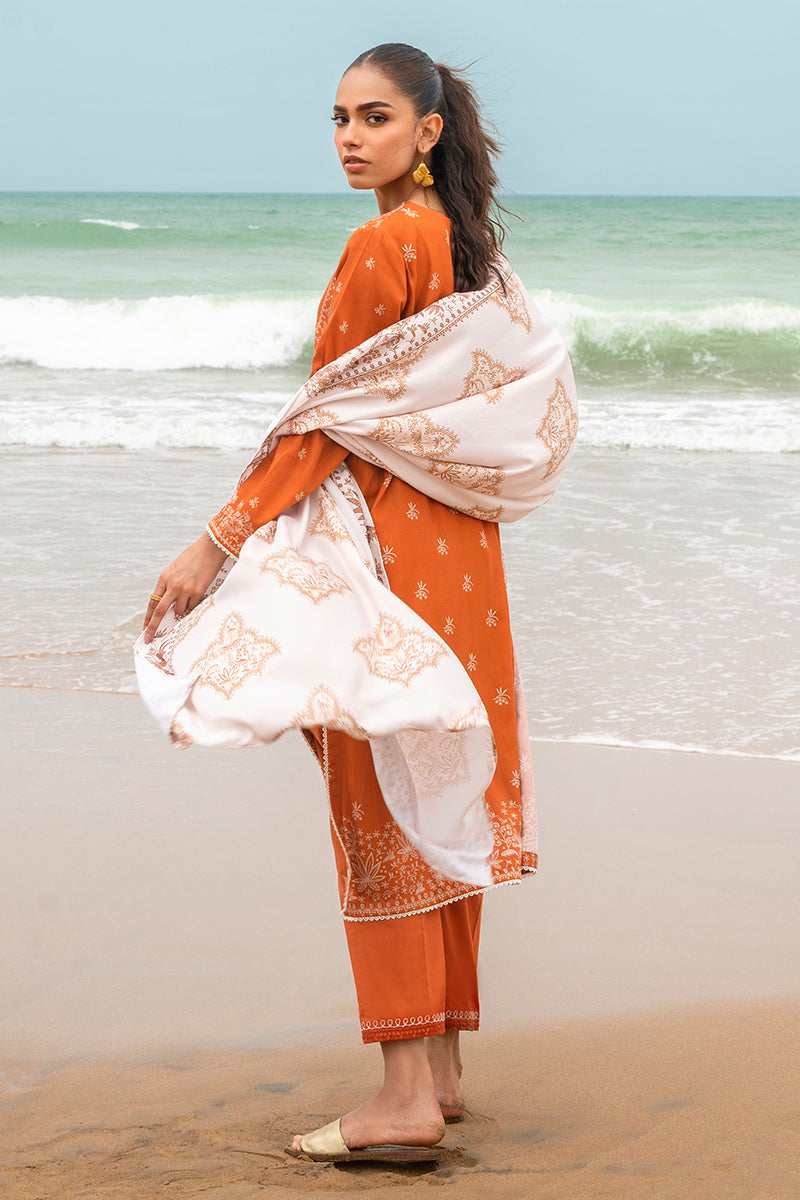 The RUST AURA-3PC SATIN PRINTED SUIT is a top-tier ensemble featuring a digital printed 100% cotton satin shirt with 40" embroidered patti for placket, dyed cambric trousers with 60" embroidered patti for trouser, and a digital printed shawl. With quality fabrics and intricate designs, this luxurious suit will instantly upgrade any wardrobe.