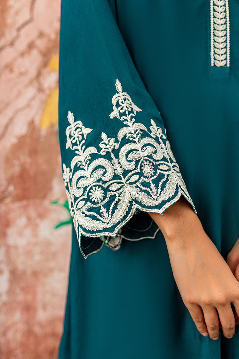 - Set in a gloomy color, Rustic Teal features a solid linen kurta with an embroidered wrap around neckline and scalloped embroidered sleeves. Style with a messy bun and scalloped trousers to complement the attire.