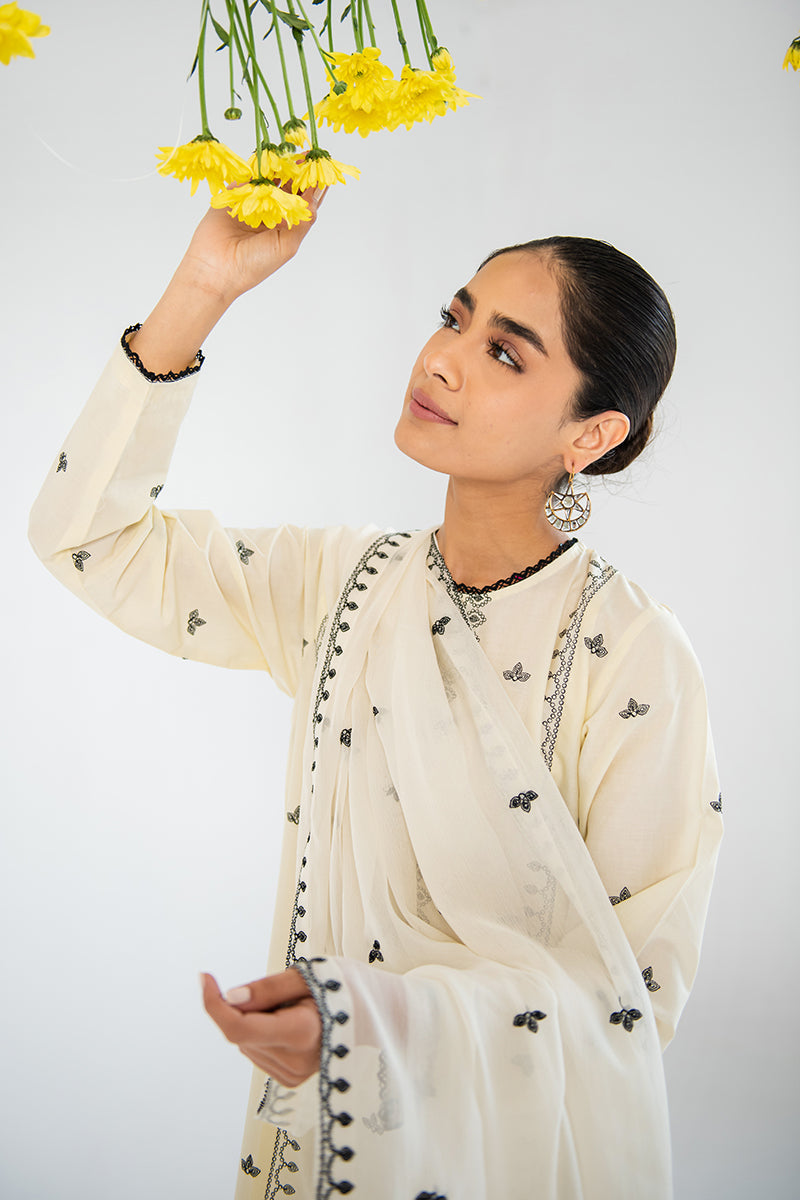 - SAND SHELL FEATURES A CHIFFON EMBROIDERED DUPATTA AND BLACK THREADWORK WITH LACE DETAILS ON THE KURTA. THE CREAMY TWO-PIECE PAIRS PERFECTLY WITH A CLEAN MAKEUP LOOK AND WHITE BOTTOMS