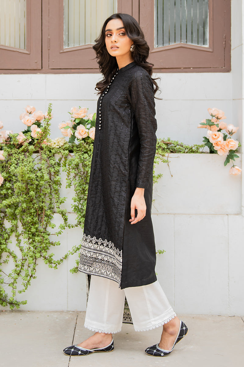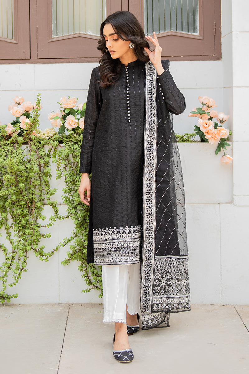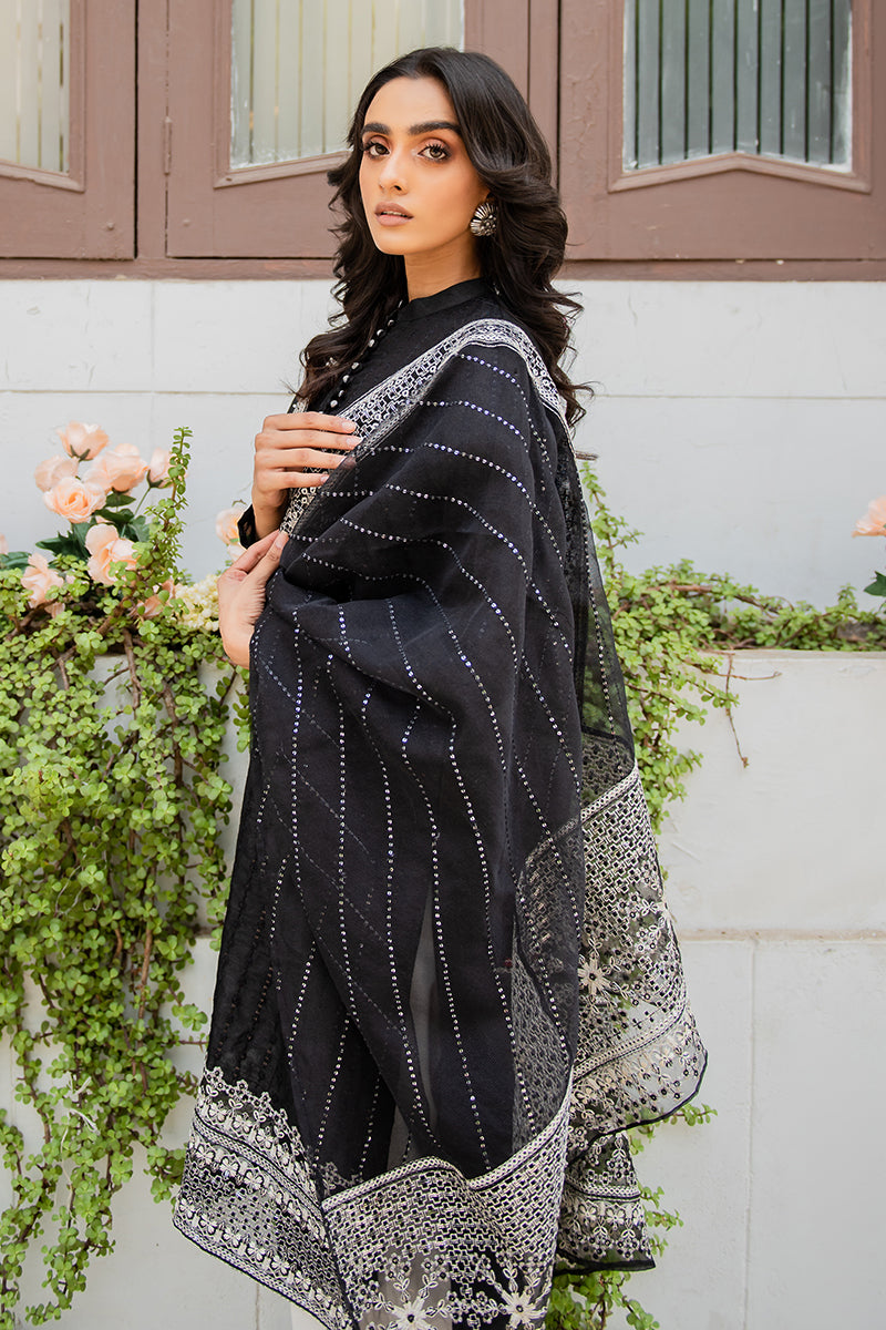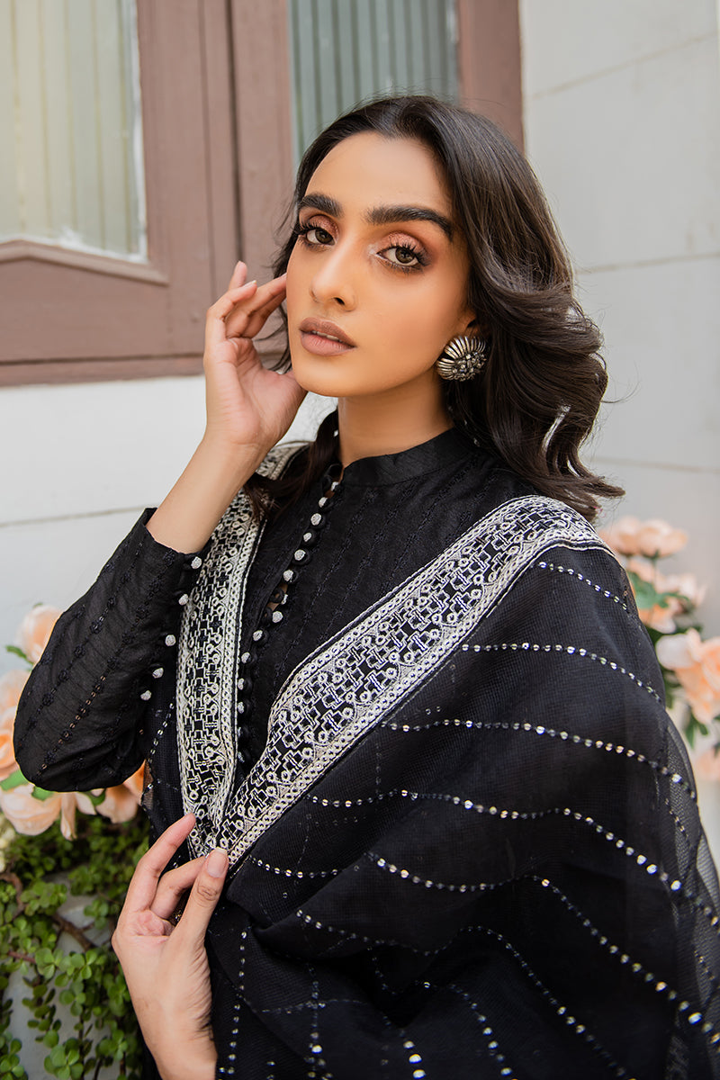 Sequin embroidered shirt enhanced with embellished tilla buttons and patchwork on the hem, shafaq comes with a sequin embroidered rajjo net dupatta and is the perfect ensemble for any festive occasion. Go simple by styling with white cigarette pants or make a monochromatic statement with black pants and black footwear.