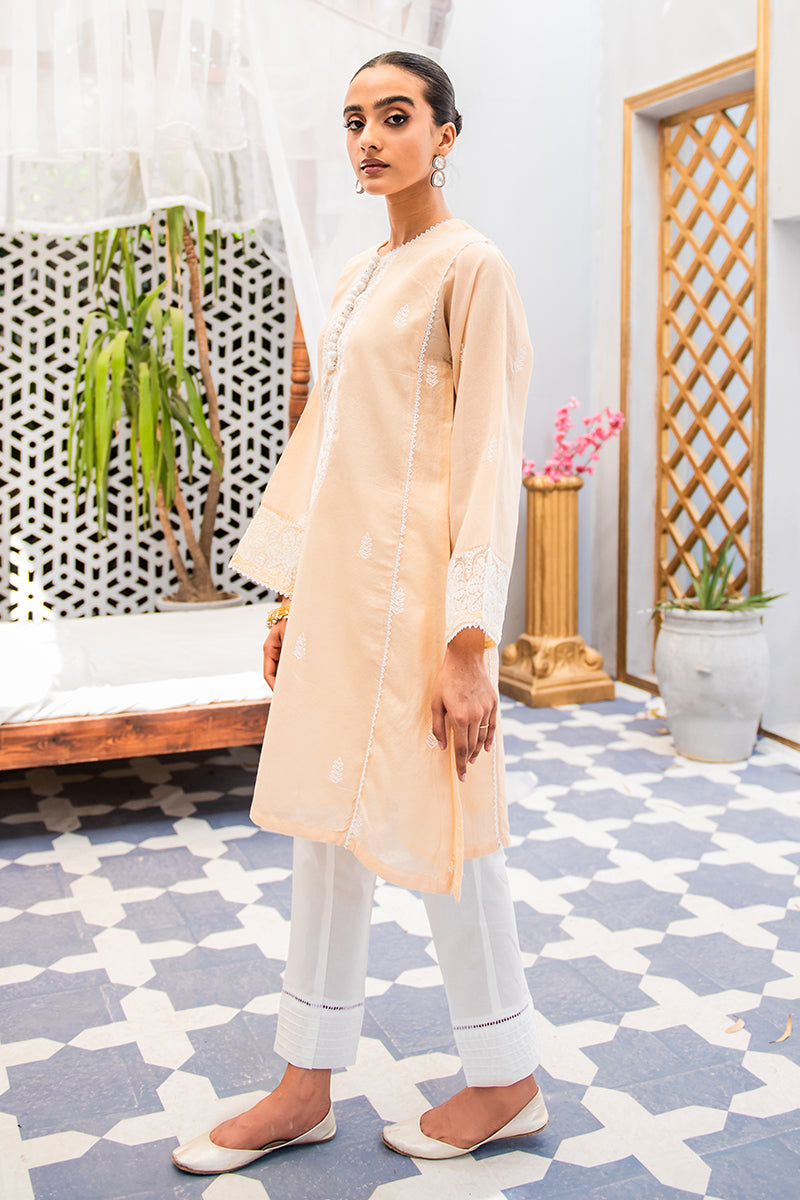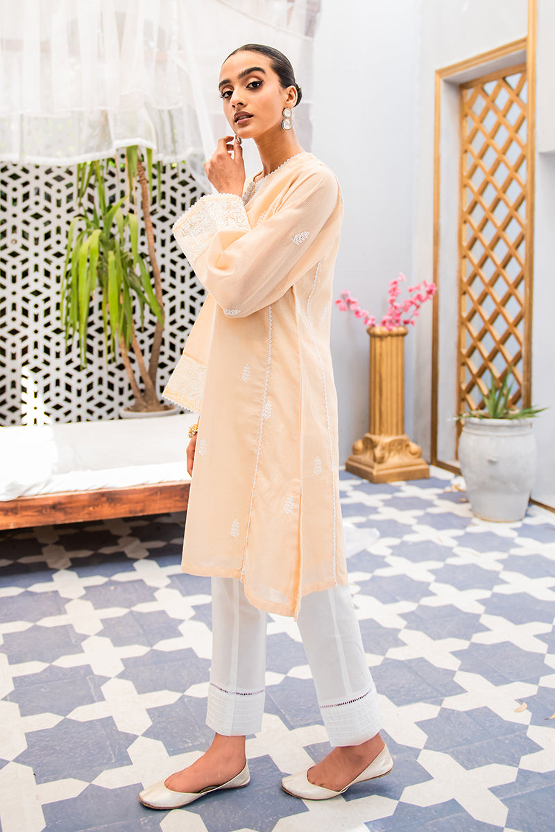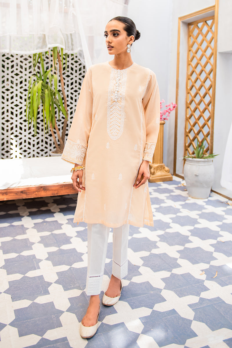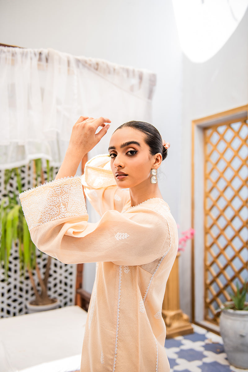 - A beige toned net kurta embellished with classic dori details and loop buttons on the neckline. Pair with cigarette pants and plain khussas.