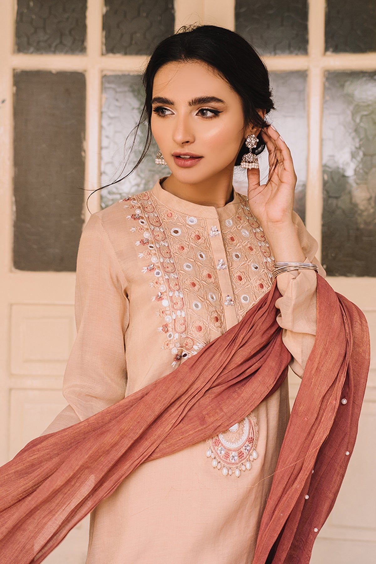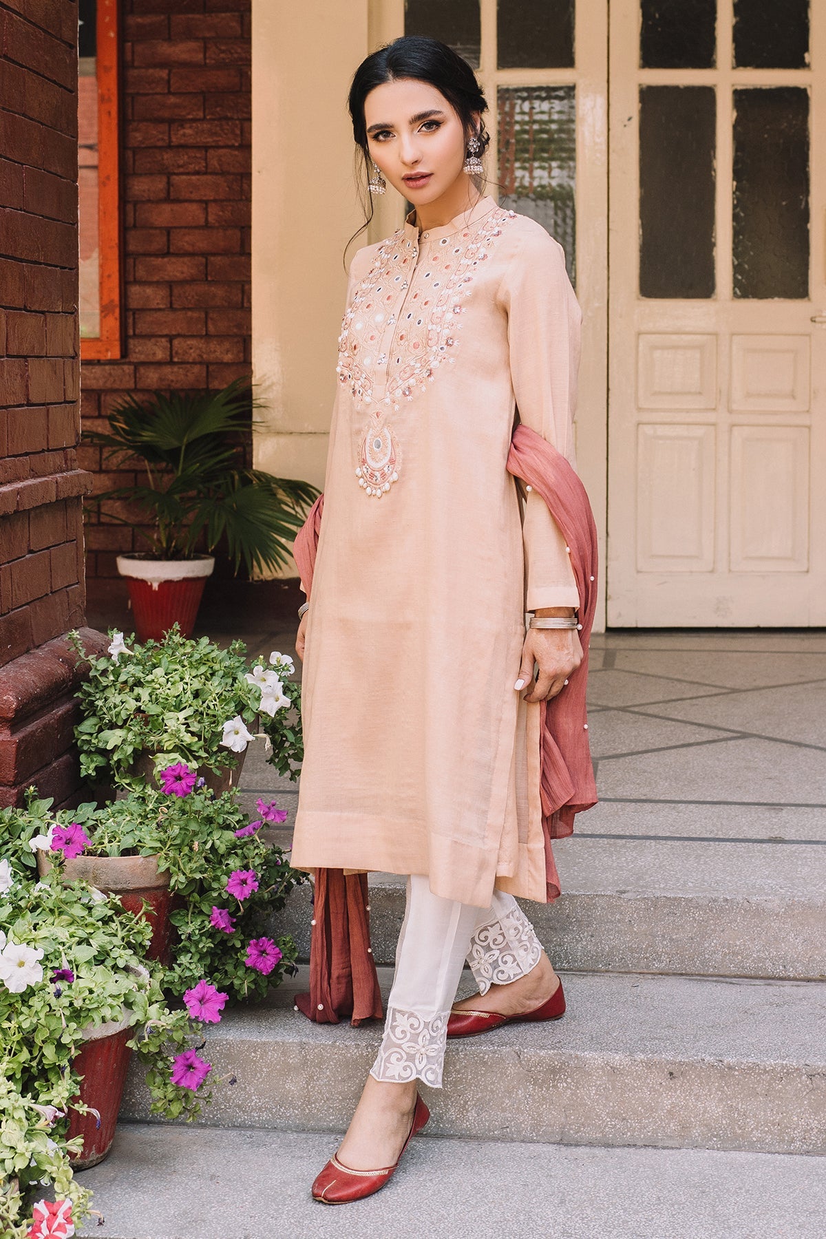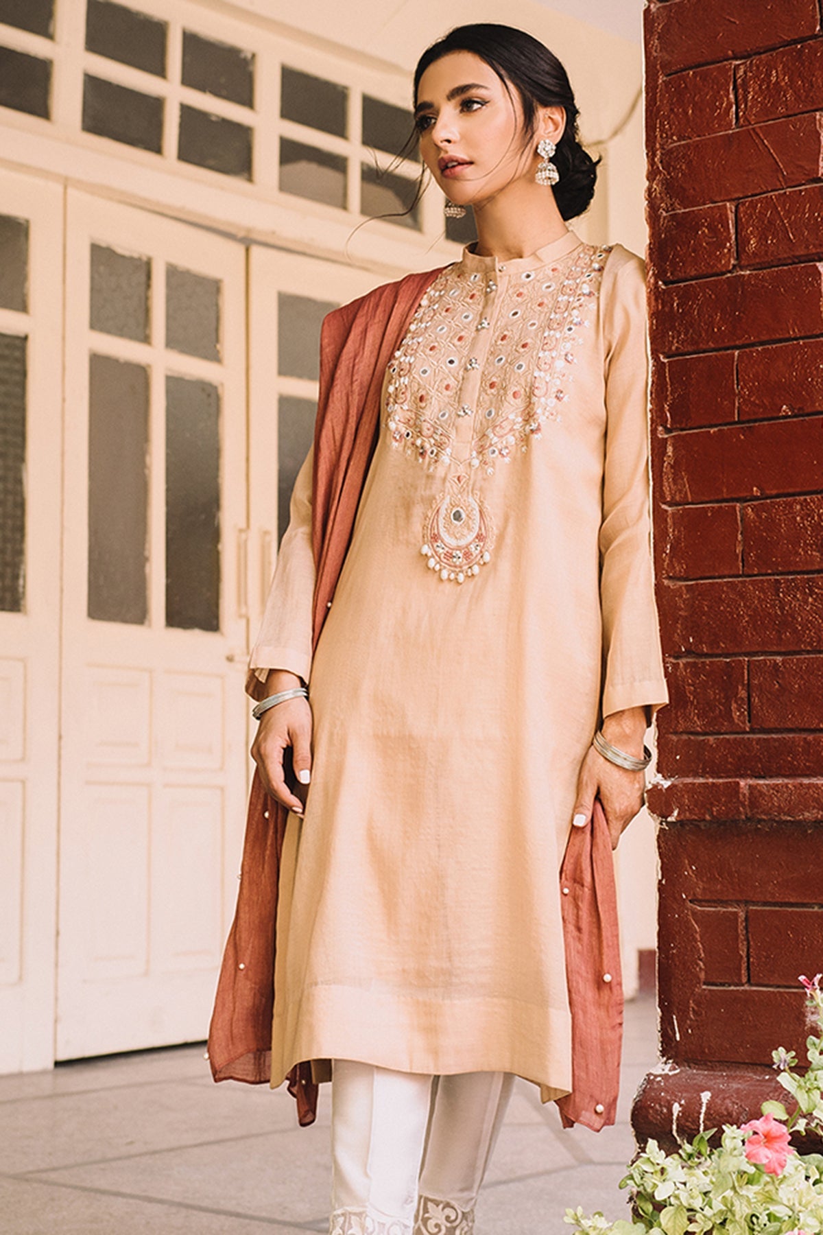 Stand Ban Collar with Slit, Full Sleeves, Embellishment on the front, Solid Dupatta with Pearl Embellishment