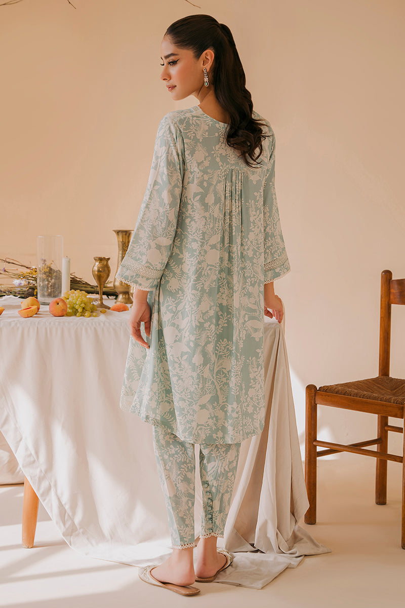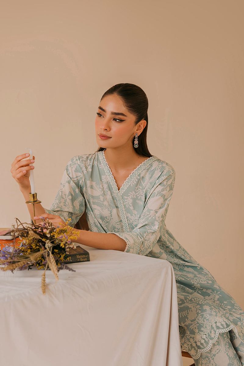 - This SOFT MINT design is perfect for everyday style. Crafted from linen fabric, this piece features a front print, back print, and neckline embroidered with lace. The sleeves are printed with linen with lace at the hem, and the tapered shalwar ensures a comfortable fit. For a modern look with a timeless elegance, SOFT MINT is the perfect choice.