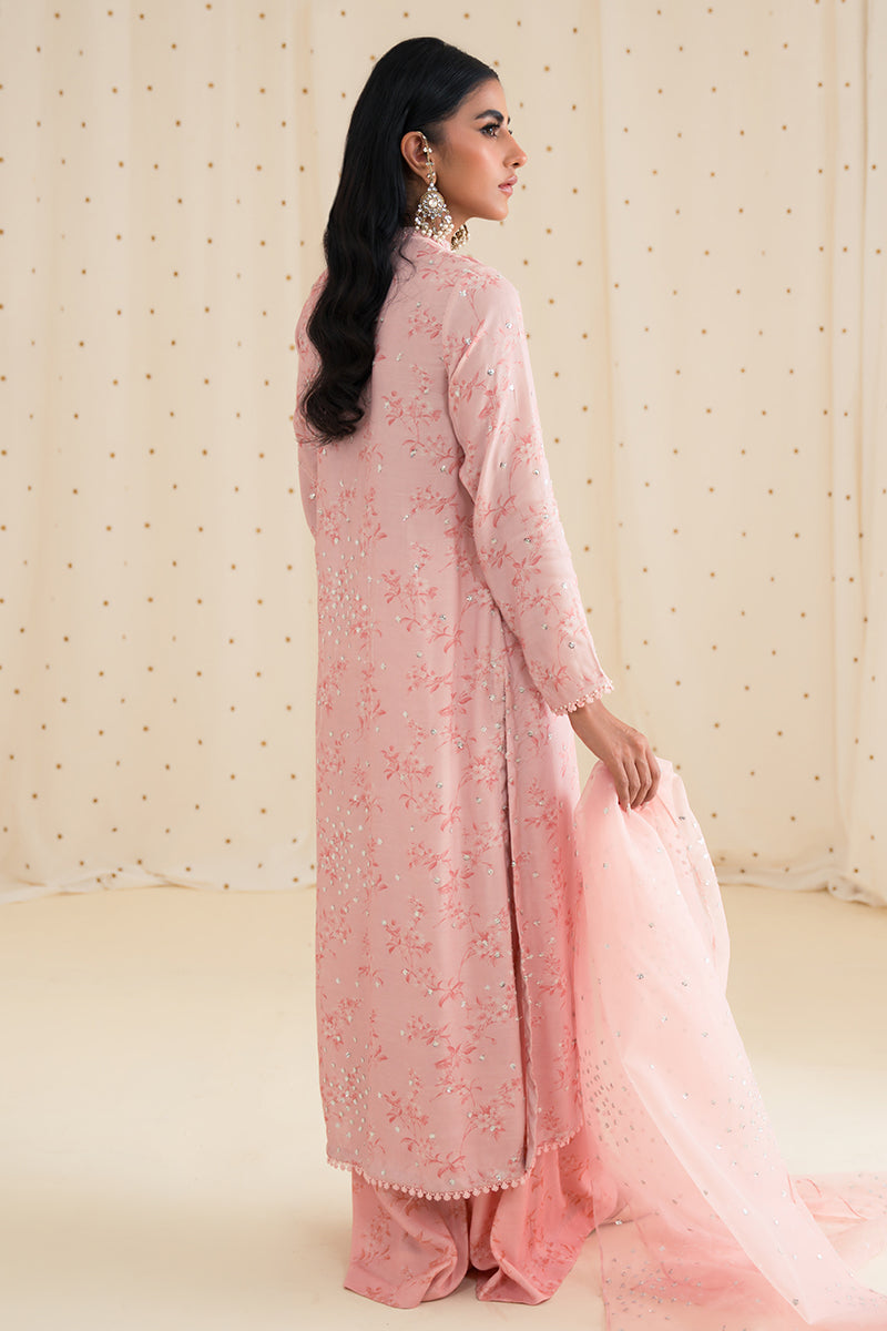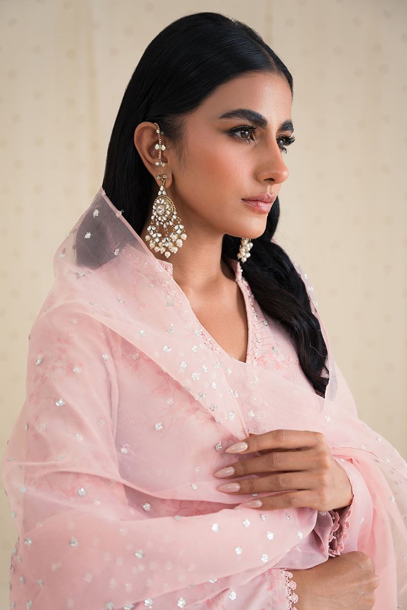 - SOFT PEARL-3 PIECE SILK EMBROIDERED SUIT is a beautiful choice for formal and casual occasions. This style straight shirt comes with a front featuring sequin embroidery and back printed, along with an embellished neckline. The set is completed with an organza embroidered dupatta and silk printed palazzo for an elegant look.