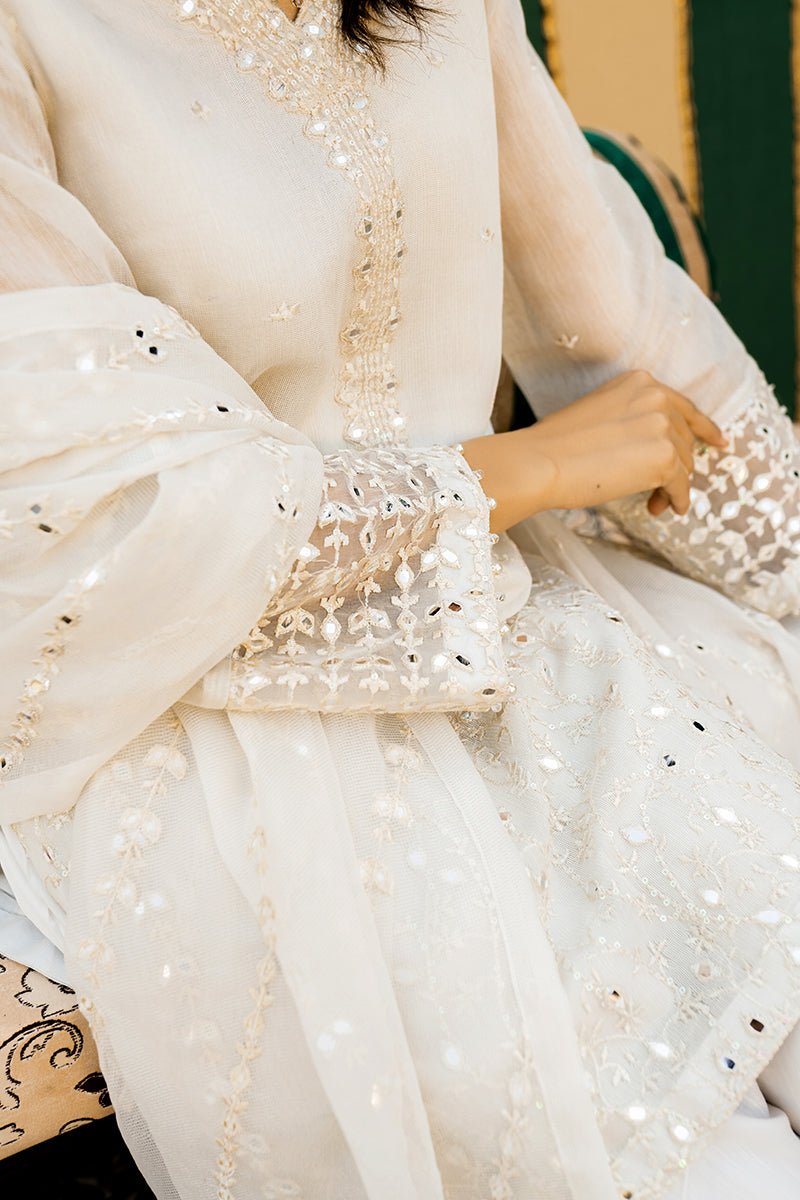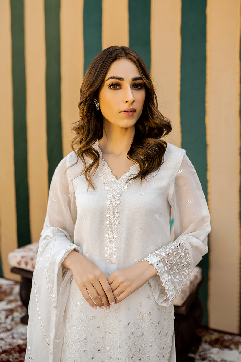 - Bringing back the old school charm with a classic white kurta with heavenly faux mirror embellishments all over the net shirt and dupatta topped off with divine pearl embellishments. Staying true to the traditional aesthetic, pair with an embellished shalwar and classic khussas.