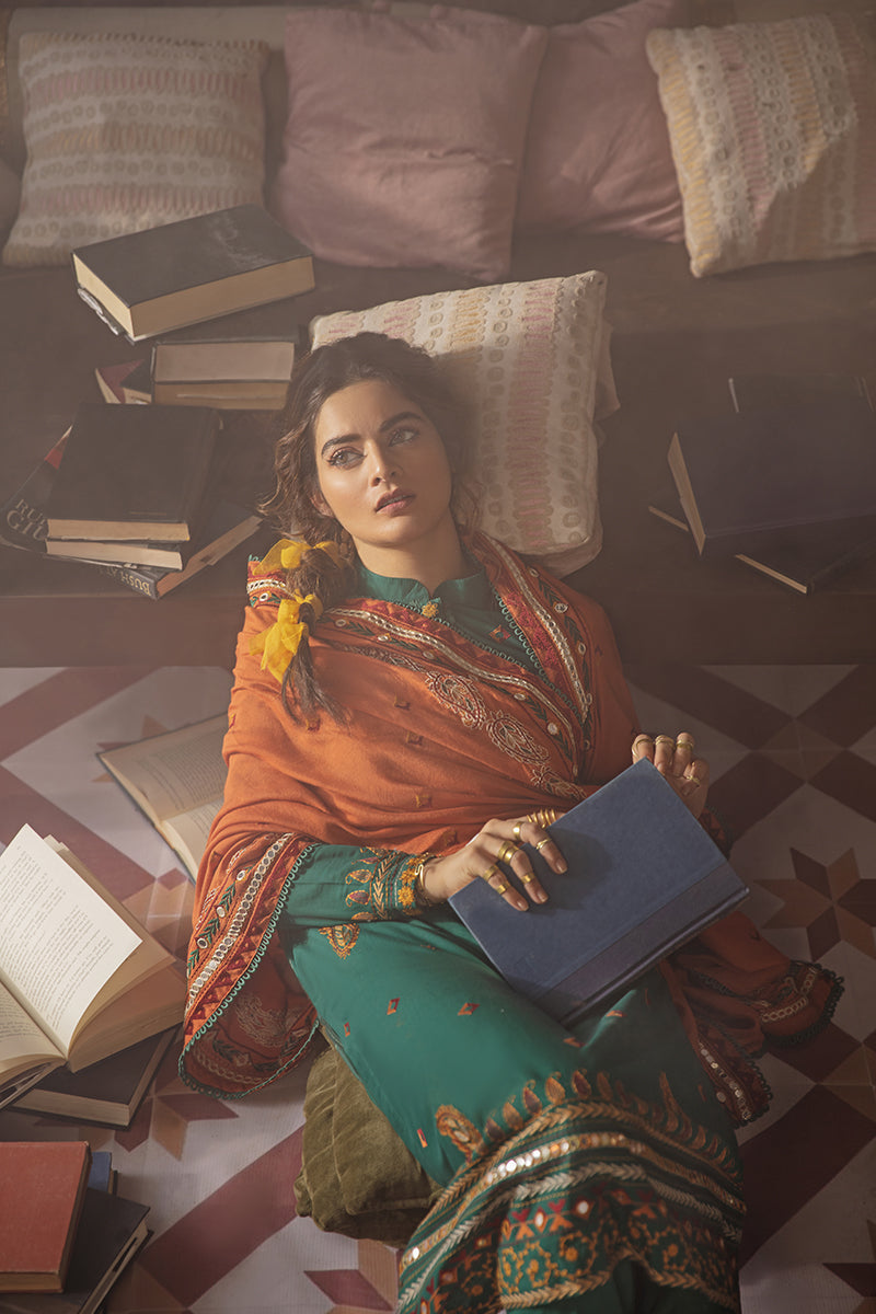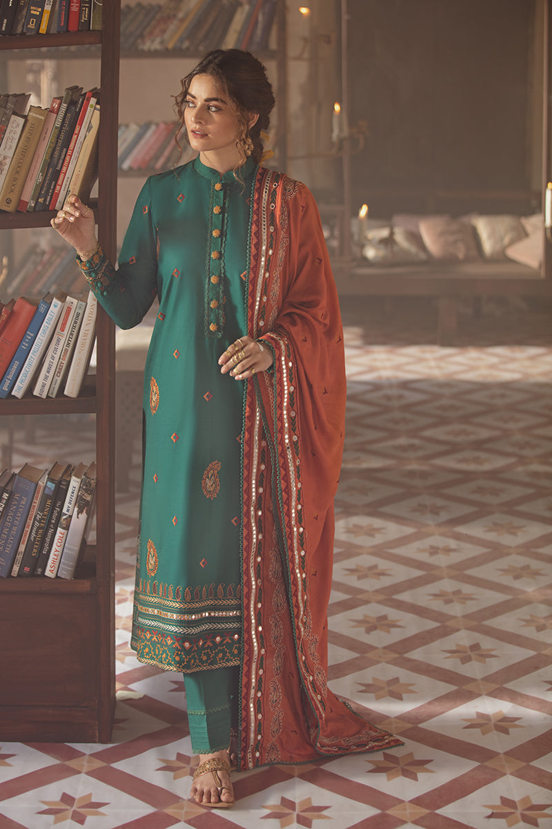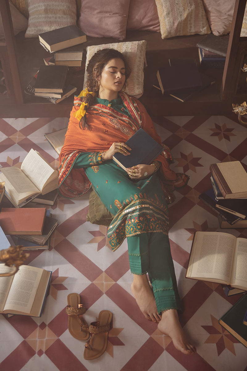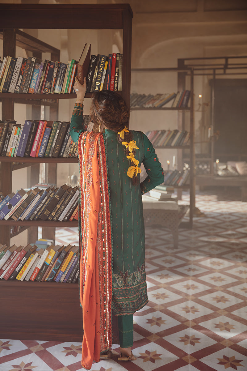 THIS FALL'S PERFECT COLOR COMBINATION- ORANGE AND GREEN- IS A STUNNING PIECE OF ART! THE INTRICATE DETAILS ON THE DUPATTA AND SHIRT’S BORDERS ADD TO THE OVERALL LOOK OF THE OUTFIT!