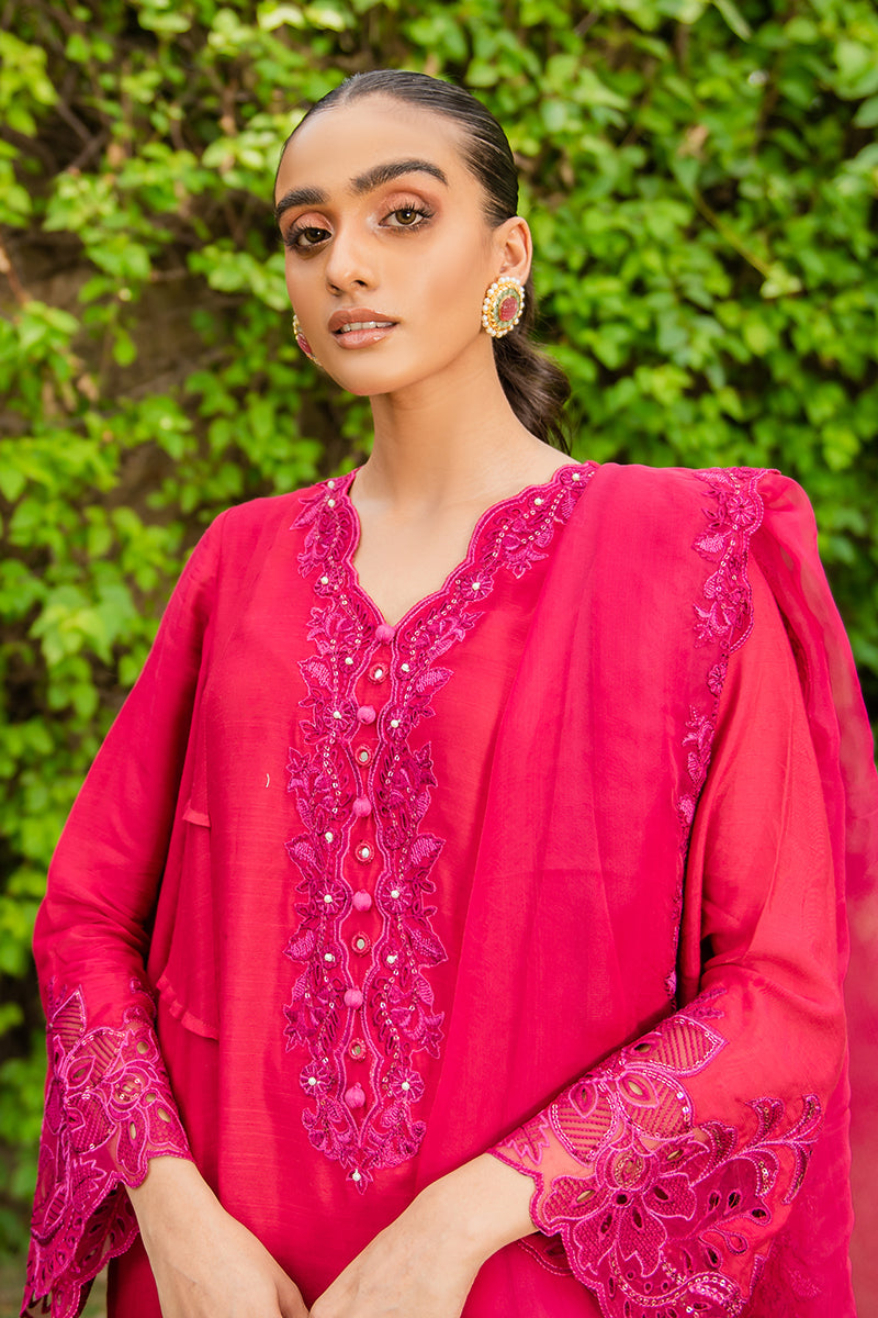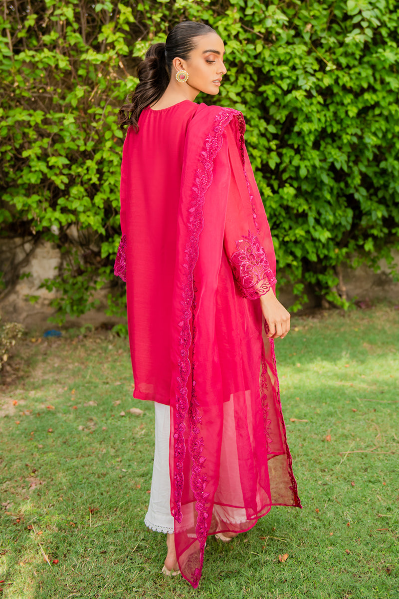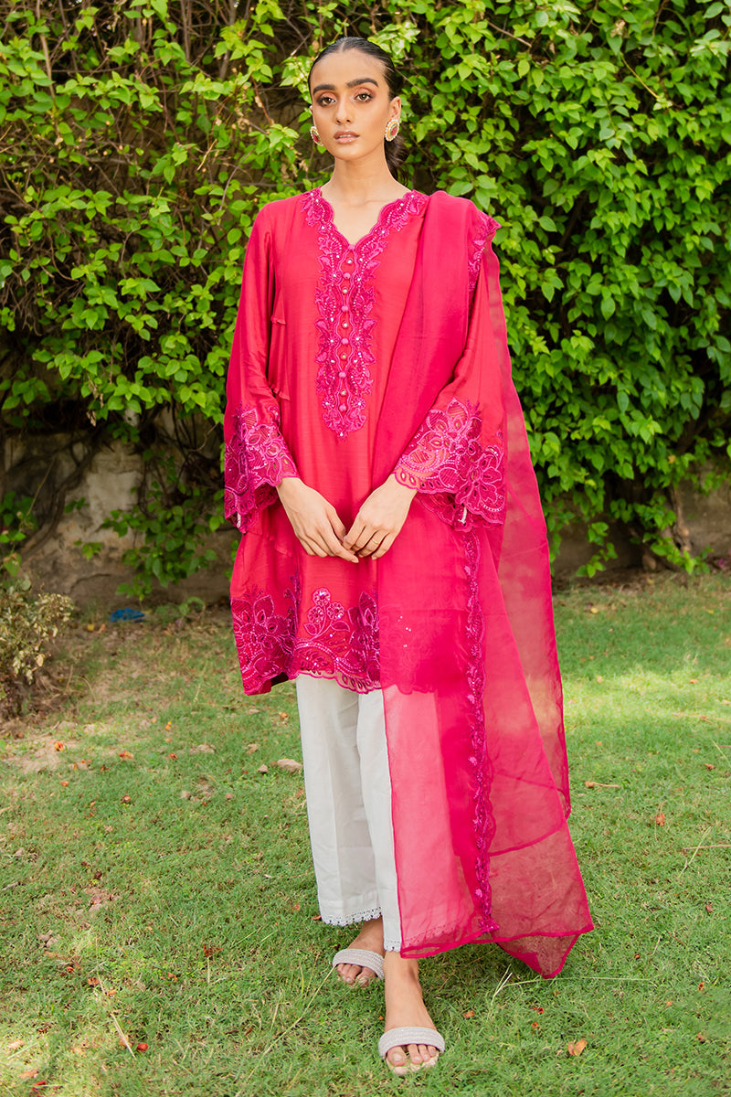 - This vibrant two-piece features front embroidered borders and pleats on side panels of the classic A-line shirt, paired with an embroidered organza dupatta. The patchwork on the fuschia attire makes this an essential for an effortless look.