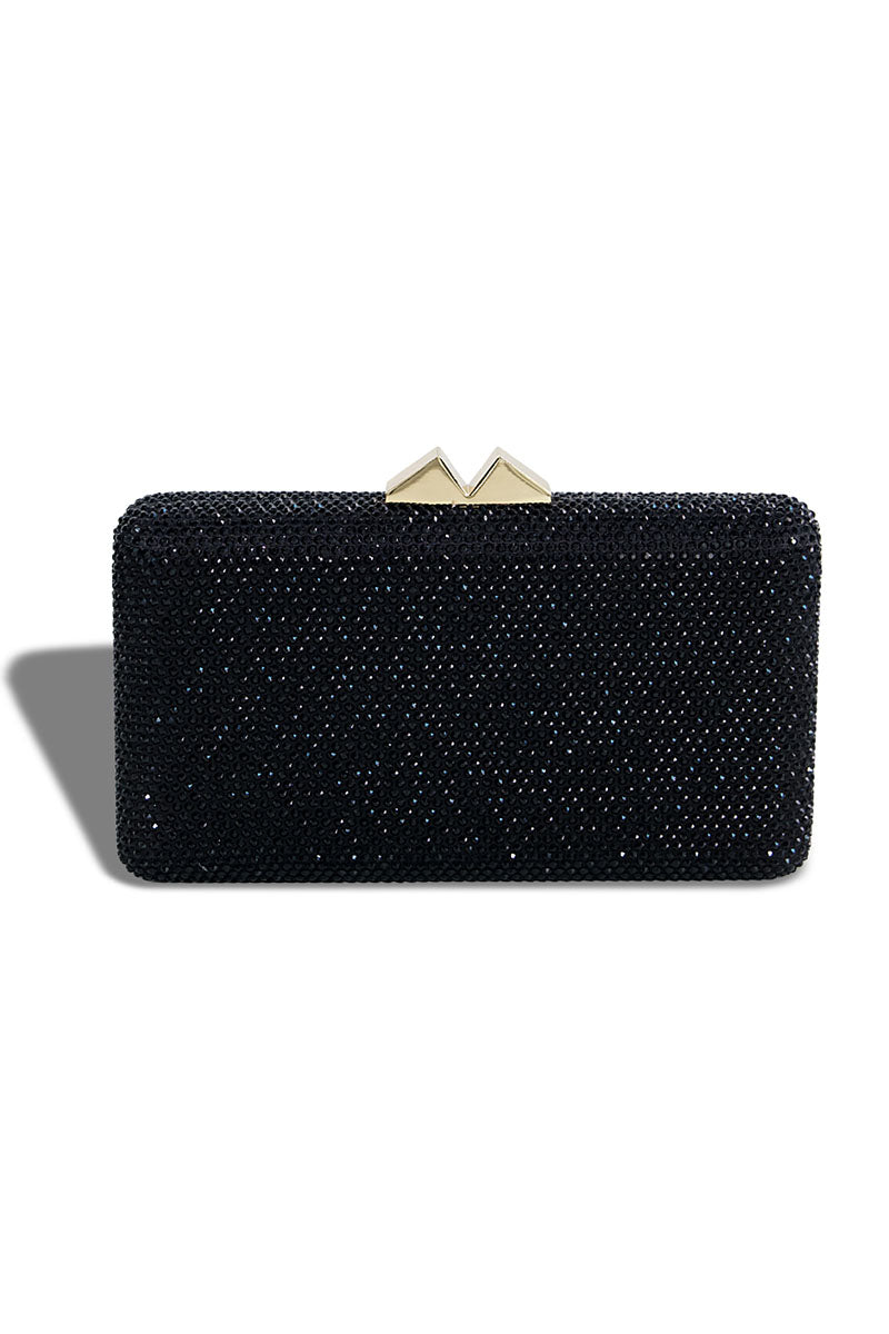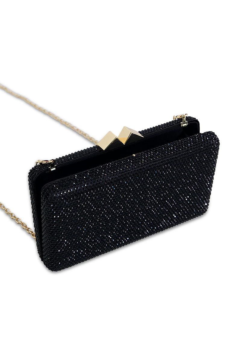 Black embellished clutch with long chain strap. Compact dimensions (4.8" H x 7.9" W) make it ideal for evening occasions or casual outings. Versatile accessory that transitions seamlessly between formal and everyday wear.