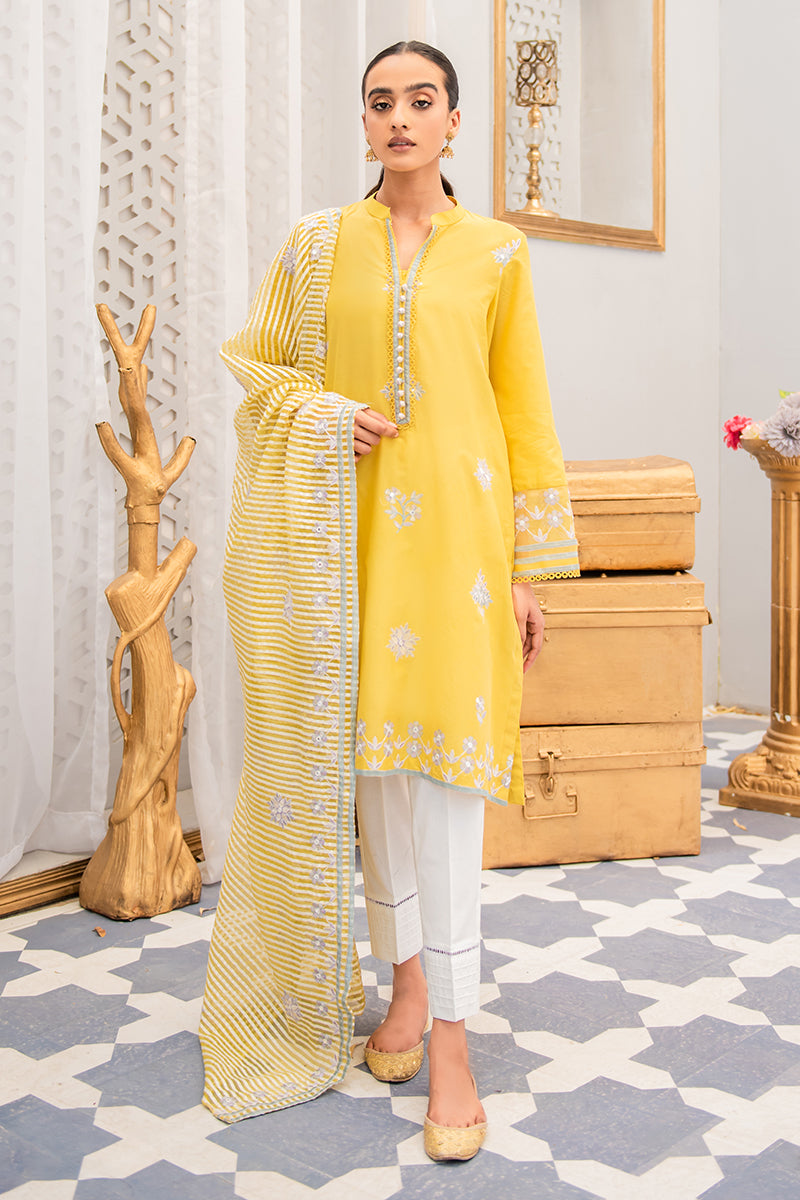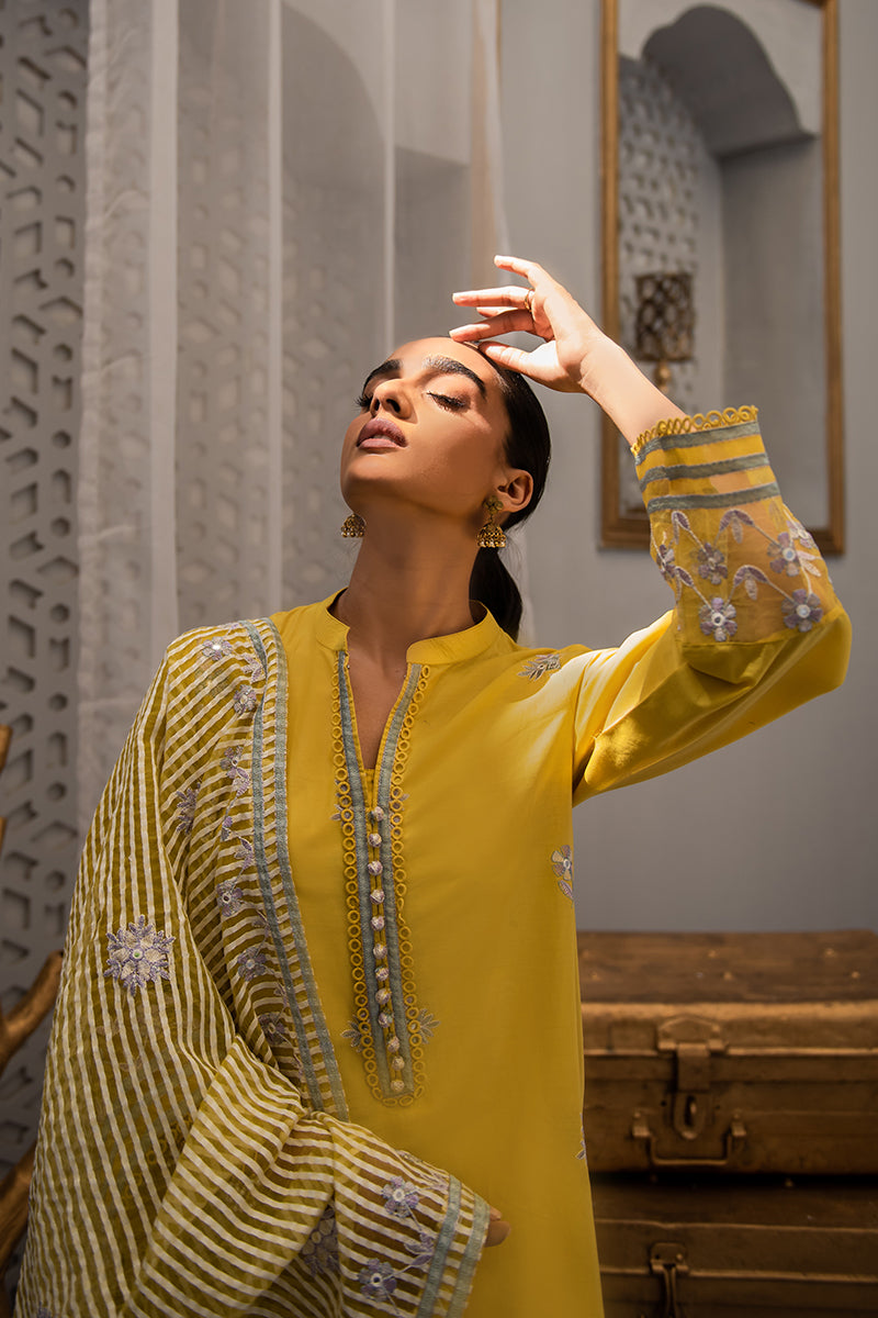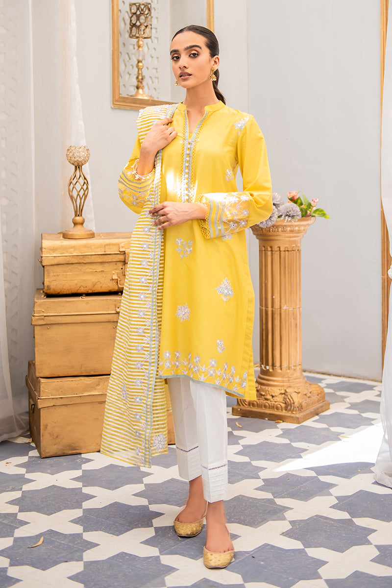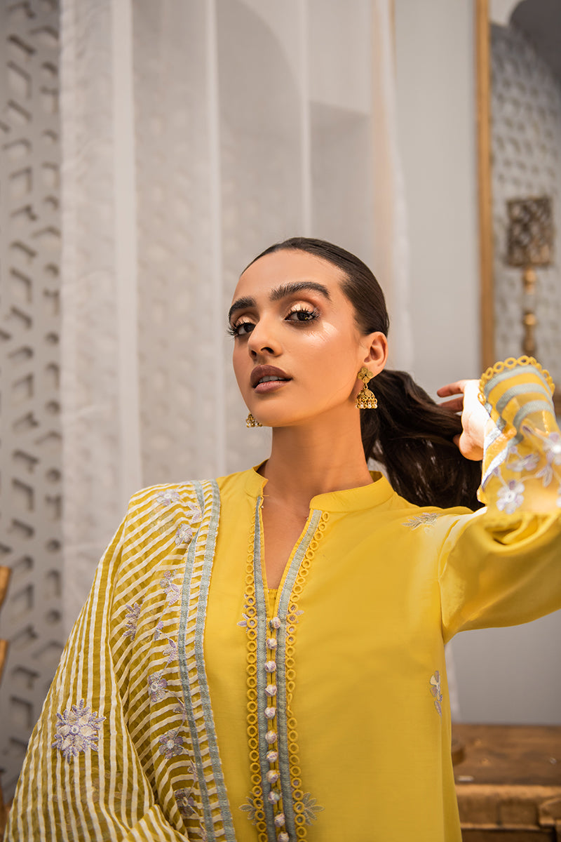 - Blooming yellow two piece embellished with stunning faux mirror embroidery on the shirt and dupatta. The exclusive pret pairs best with bronze makeup and jhumkis to top off the look