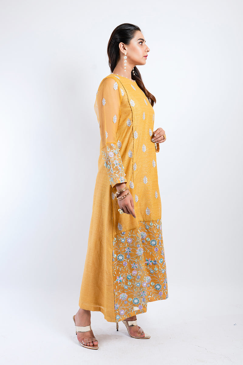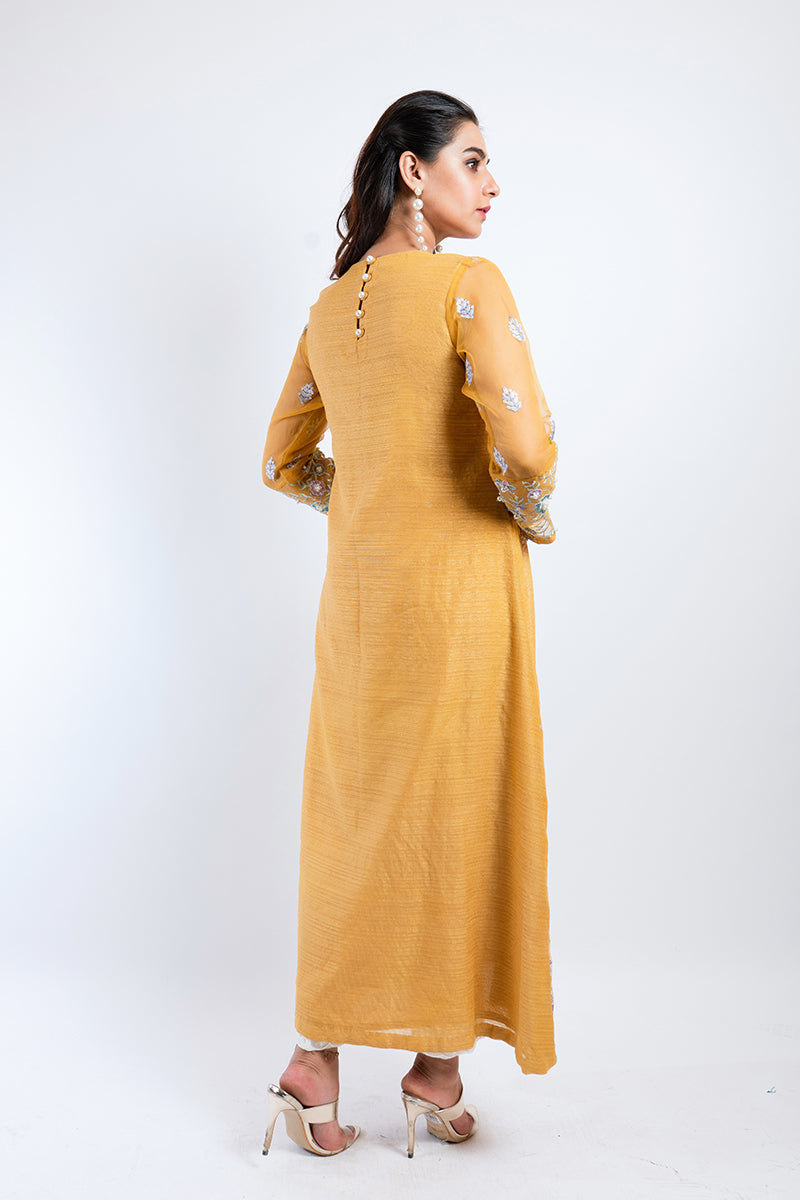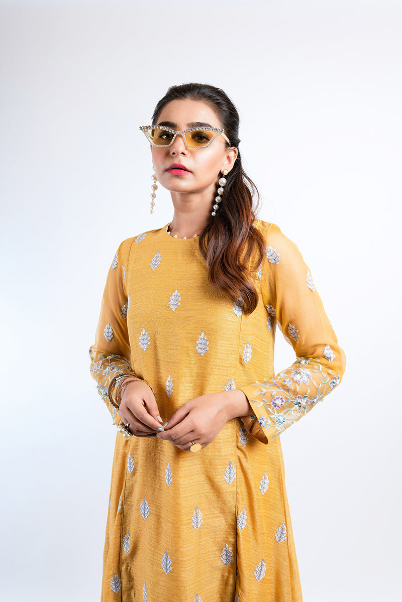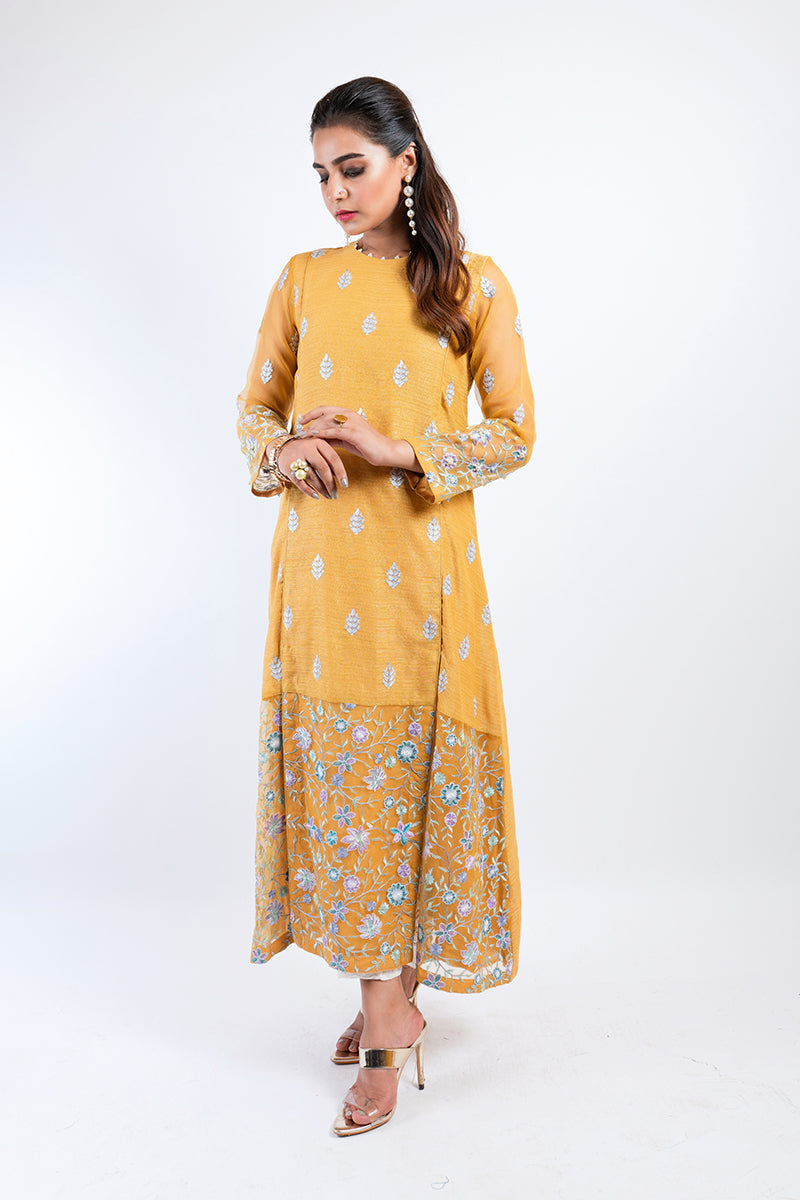 Sunehri, like the name, has a bright feel to it with a full length that goes best with a pair of beaded ear pieces and churidar.