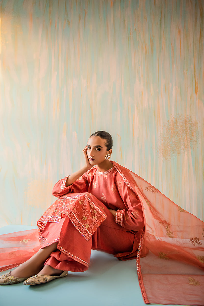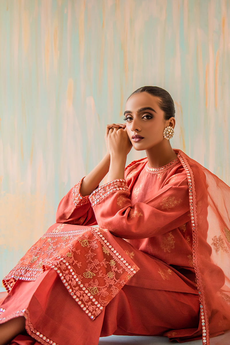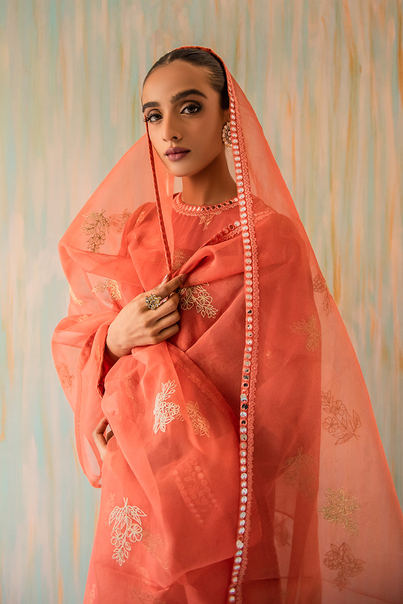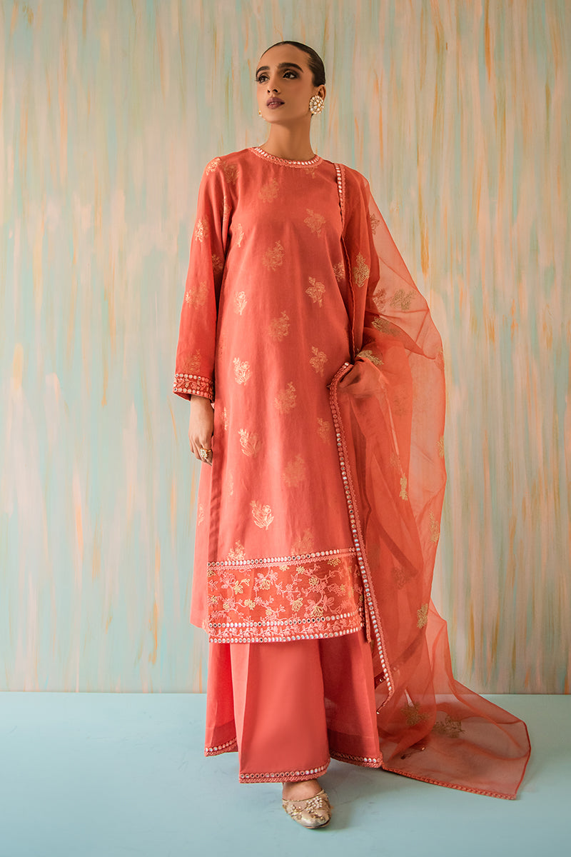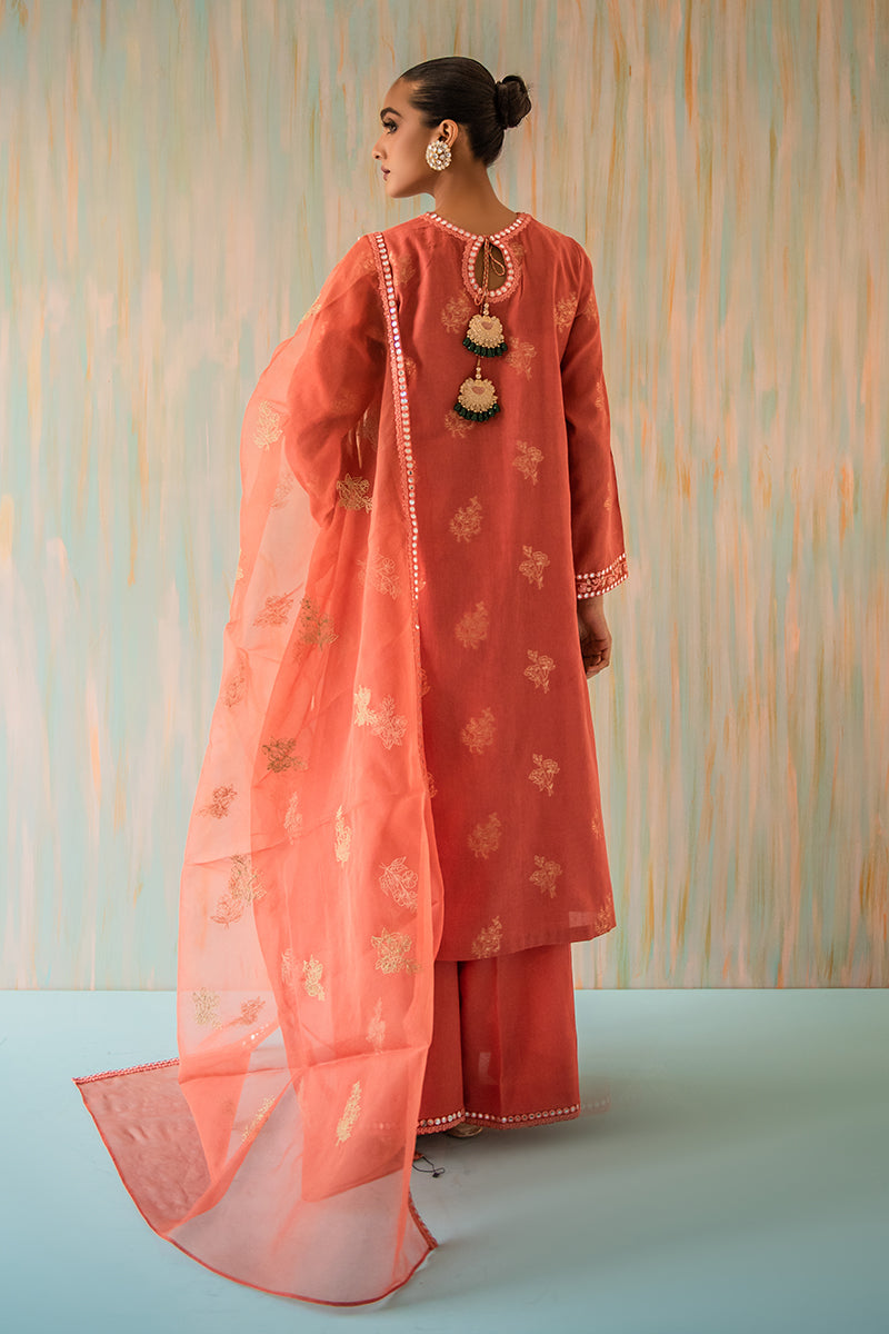 - This 3 piece orange jacquard suit is embellished with embroidery on the borders and neck. Pair it up with a sleek bun and contemporary kundan studs.