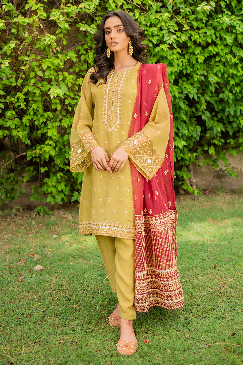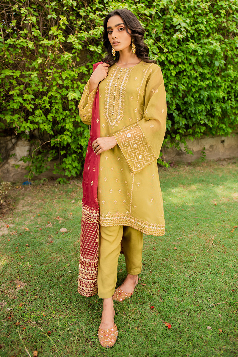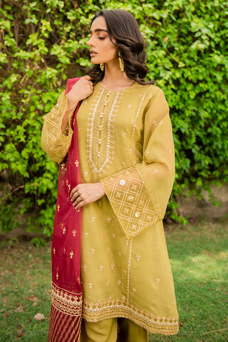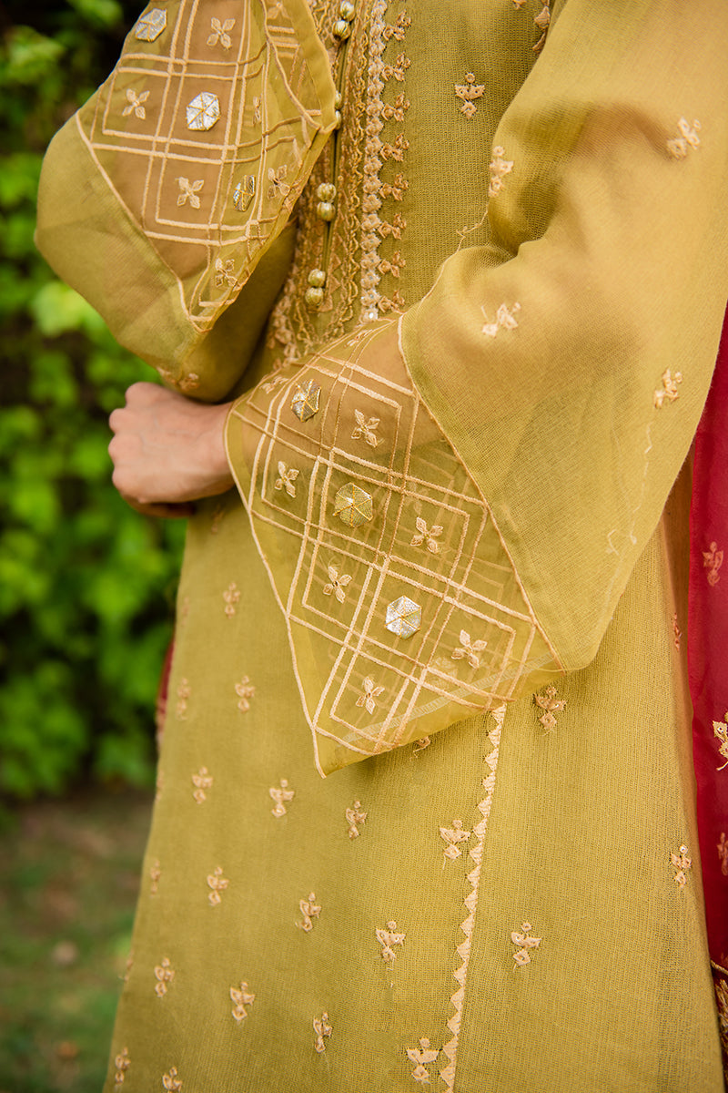 A unique green khadi net kurta, which is fully embroidered with gota buttons along box sleeves with embroidery and gota embellishments. Styled with an embroidered red organza dupatta and tapered raw silk shalwar, Tabassum comes to the rescue when you want to flaunt a festive traditional look..