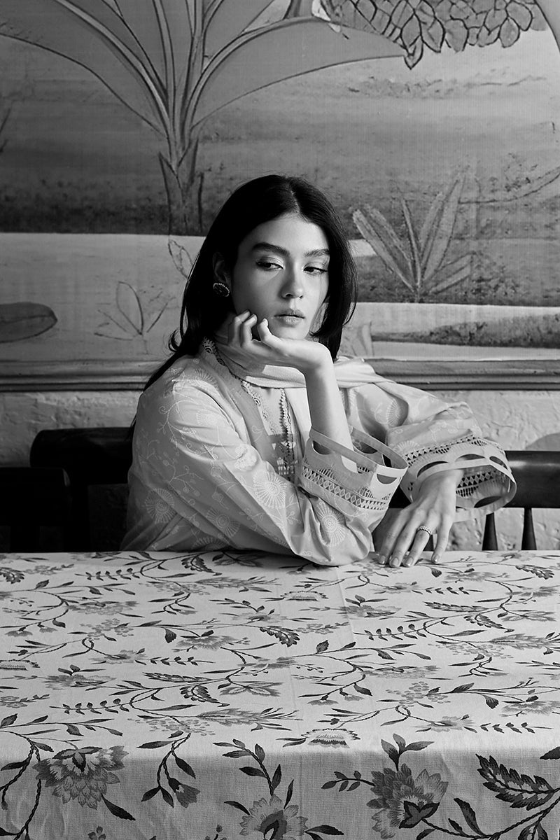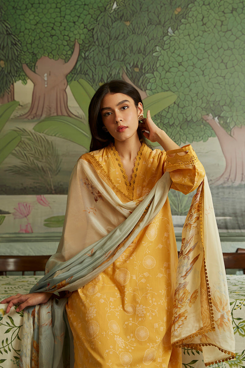TAN GOLD features a digital printed cambric shirt with one embroidered neckline and 40" embroidered patti for hem. The set also includes a dyed cambric trouser and a Silk digital printed dupatta. The combination of these high-quality materials offers a fashionable and comfortable outfit.