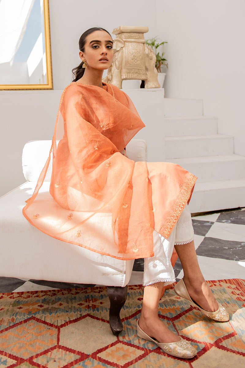 - Give yourself a touch of elegance with this irresistible embroidered two-piece. The tangerine ensemble is paired best with lace embellished trousers and traditional jewelry.