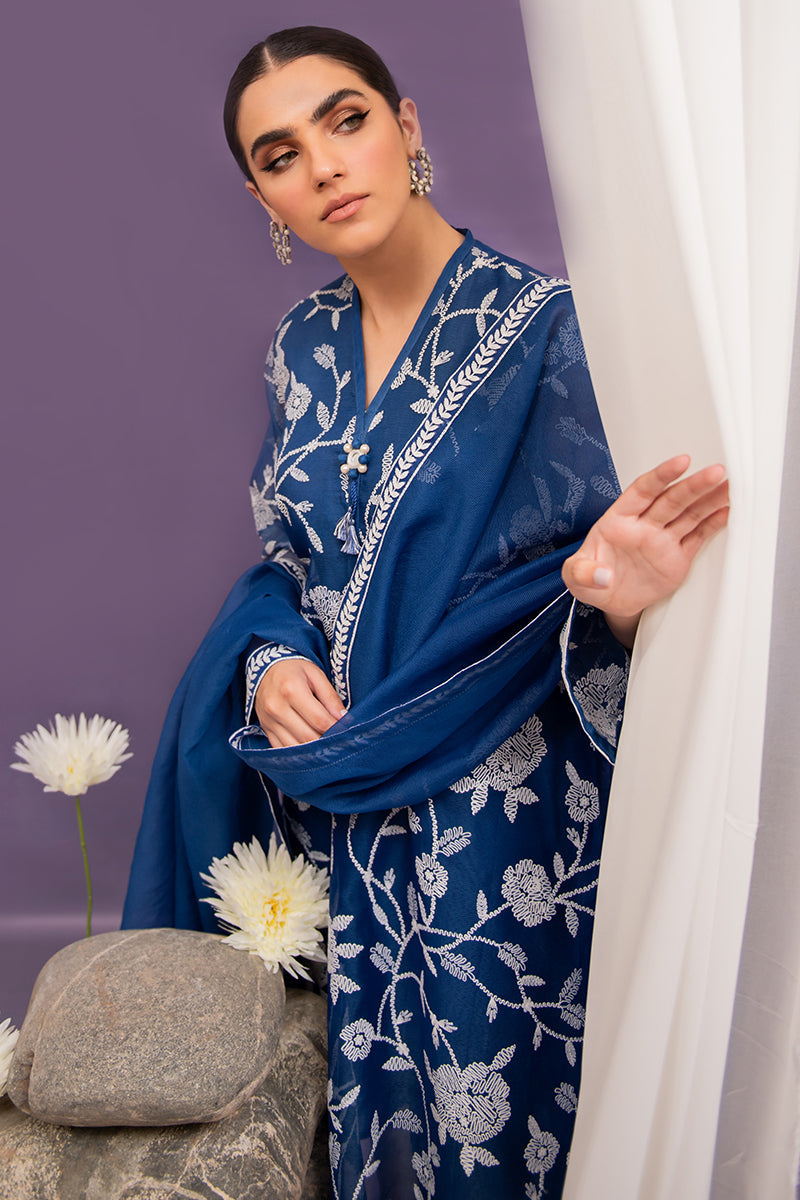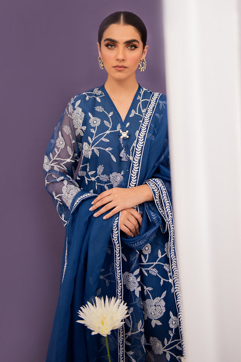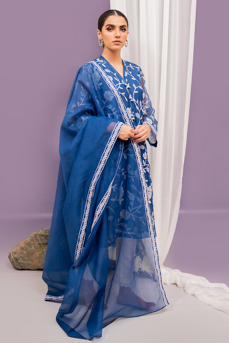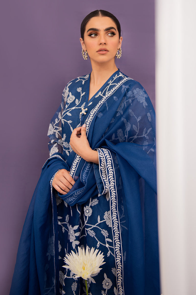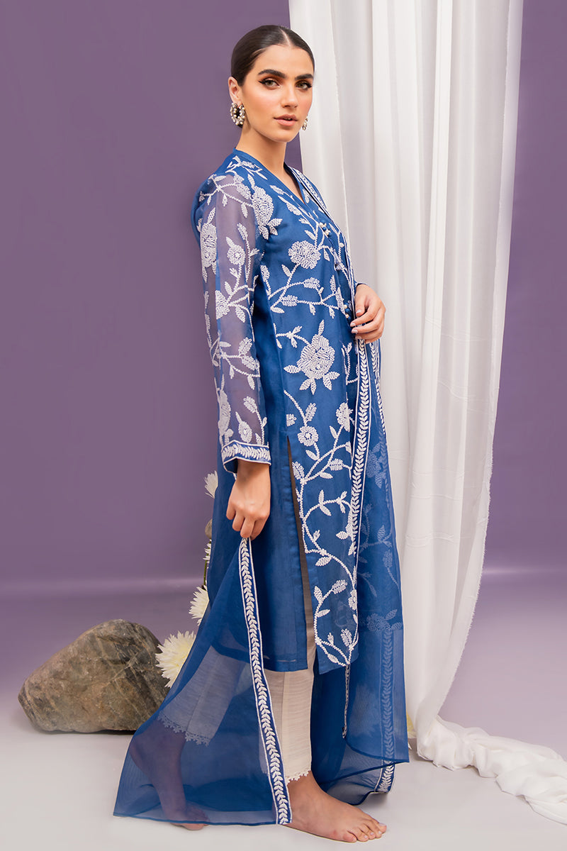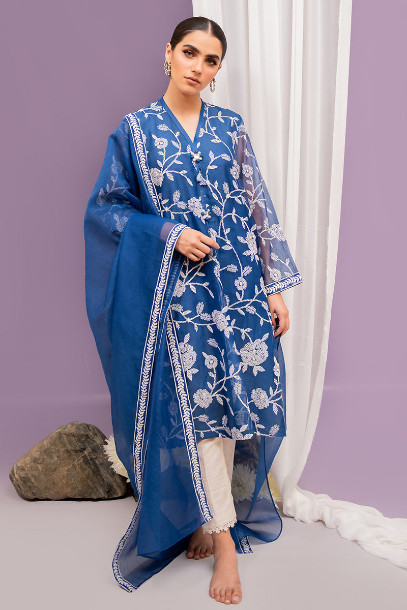 - A-LINE SHORT SHIRT WITH DORI EMBROIDERY PAIRED WITH A RAJJO NET EMBROIDERED DUPATTA. STYLE THE INK BLUE EMBROIDERED TWO PIECE WITH WHITE PANTS SUBTLE KHUSSAS AND LOOSE CURLS.