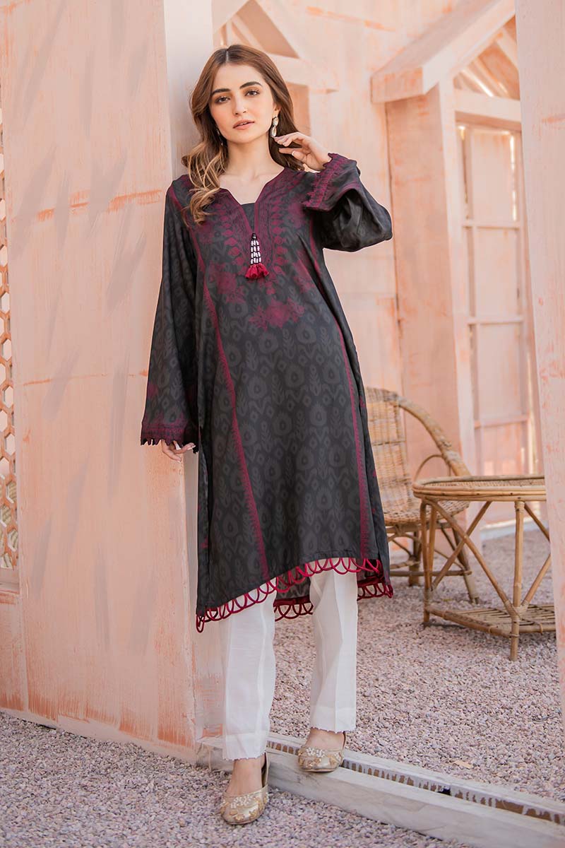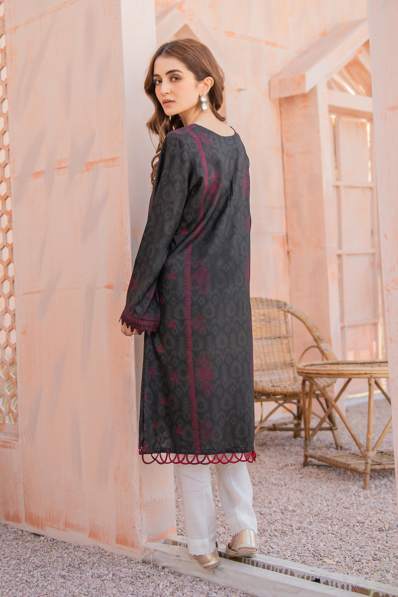 A Dusky Charcoal Toned Kurta Digital Printed in a Classic Pattern and with Lace Detail on Hem. Pair the Kurta with White Cigarette Pants and Curled Hair.