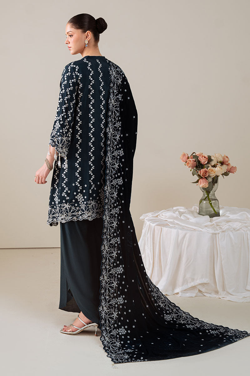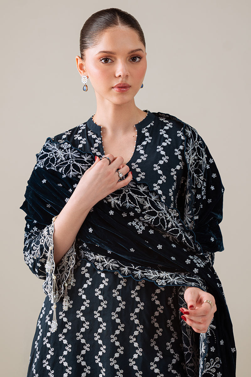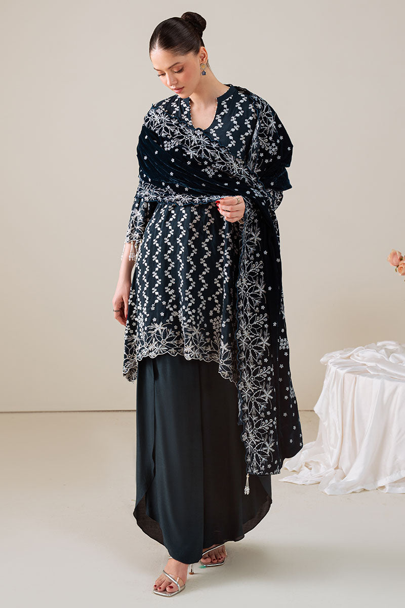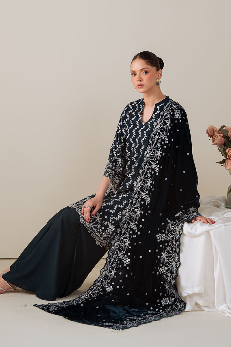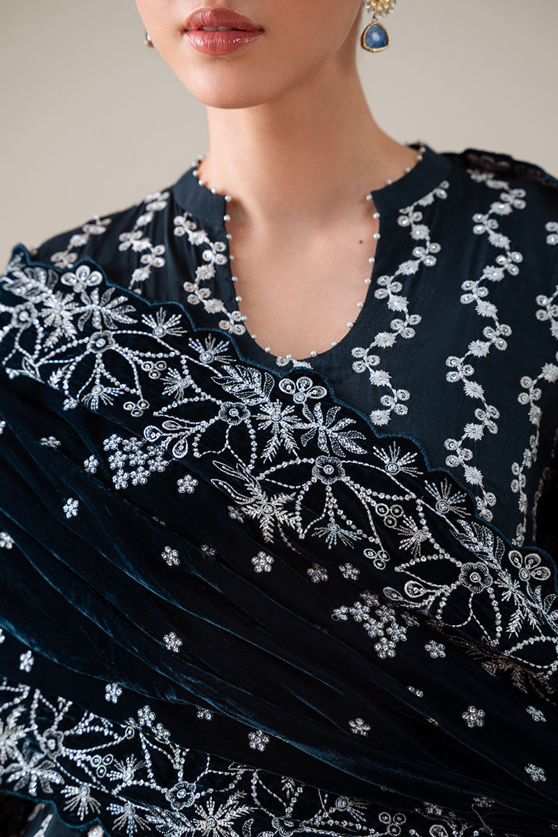 - This Tropical Teal 3-piece suit features a silk embroidered shirt with intricate detailing on the front, back, and sleeves, offering both elegance and comfort. Complemented by a richly dyed silk trouser, it ensures a smooth and refined look. The ensemble is completed with a velvet embroidered dupatta, adding a luxurious touch and enhancing the overall sophistication of the outfit. Ideal for formal occasions, this suit combines traditional craftsmanship with premium fabrics for a distinguished appearance.