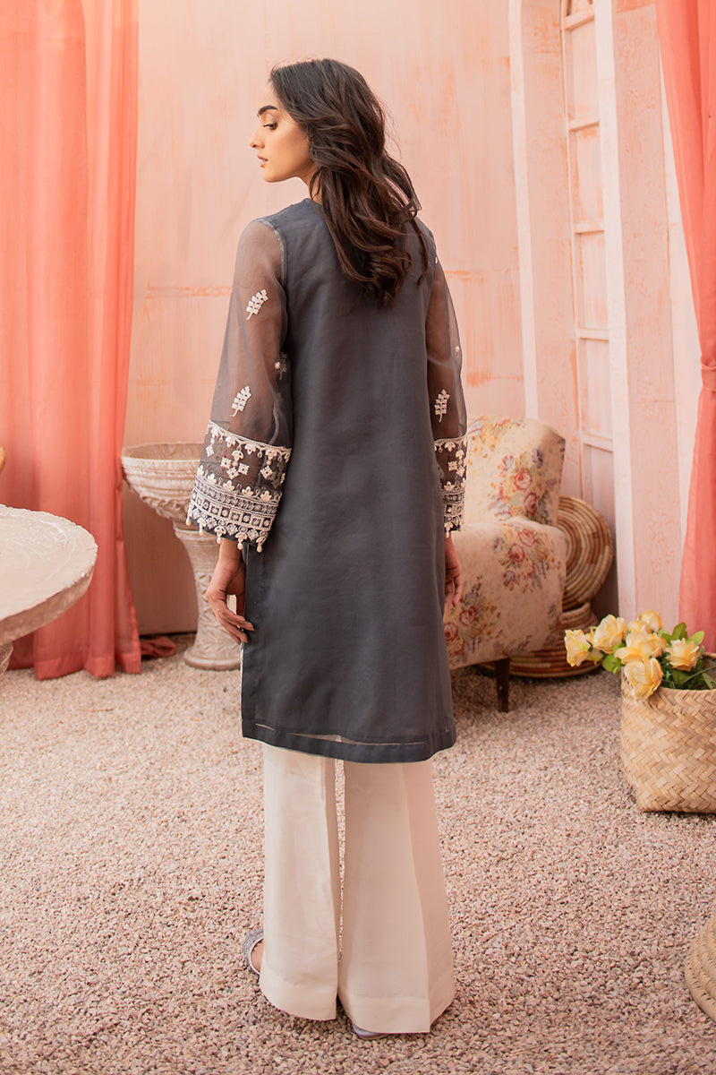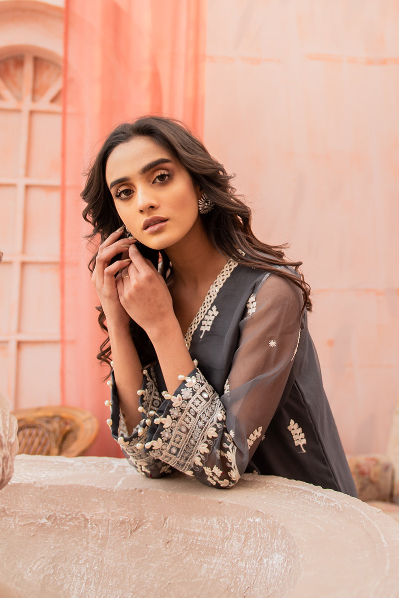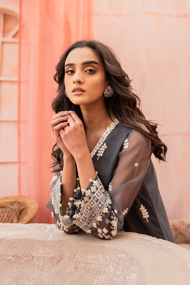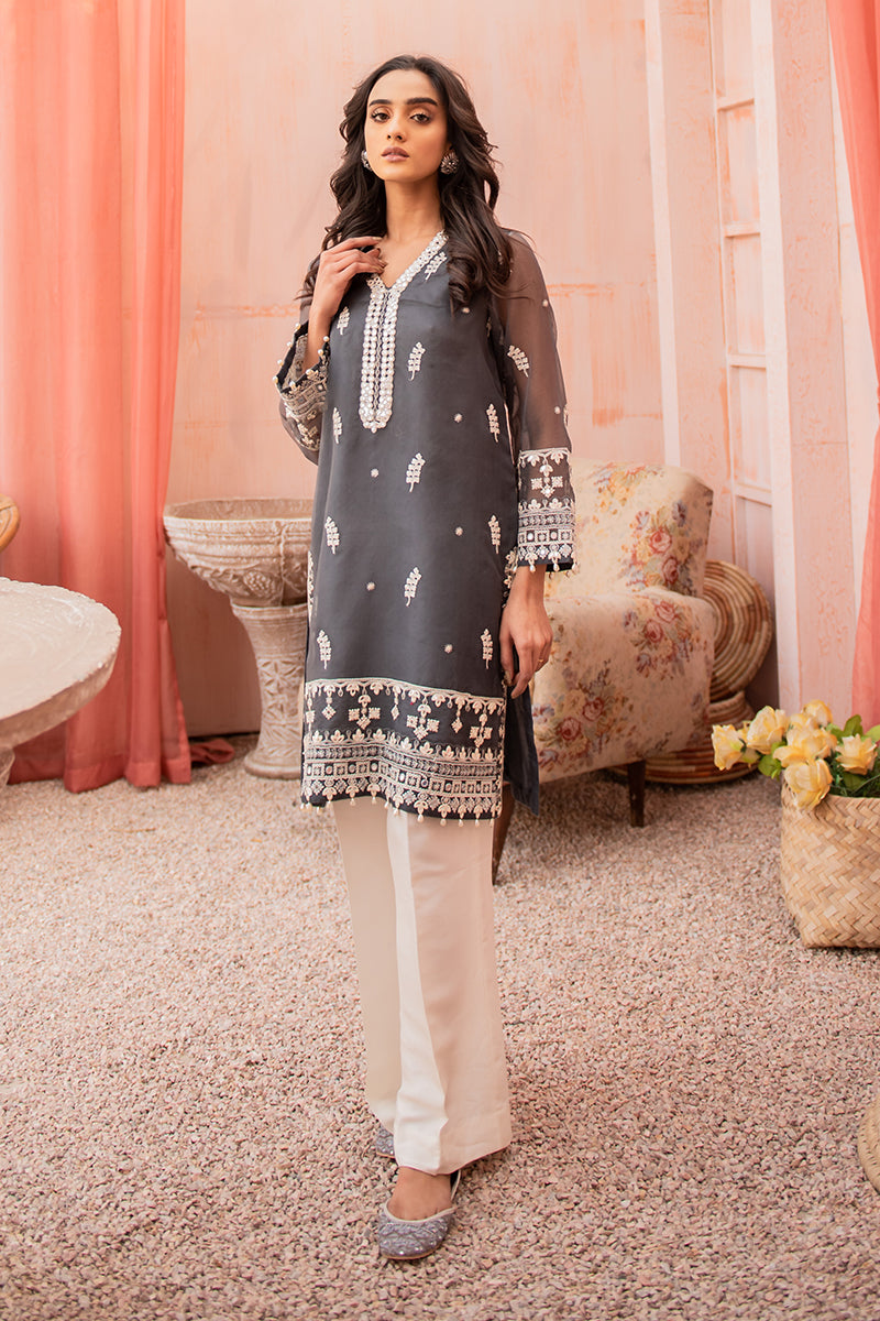 - A beguiling gray shirt rendered on breathable organza fabric. The V-neck kurta is embellished with beautiful threadwork and pearl hangings on the sleeves and hem. Pair with flared trousers and silver accessories.