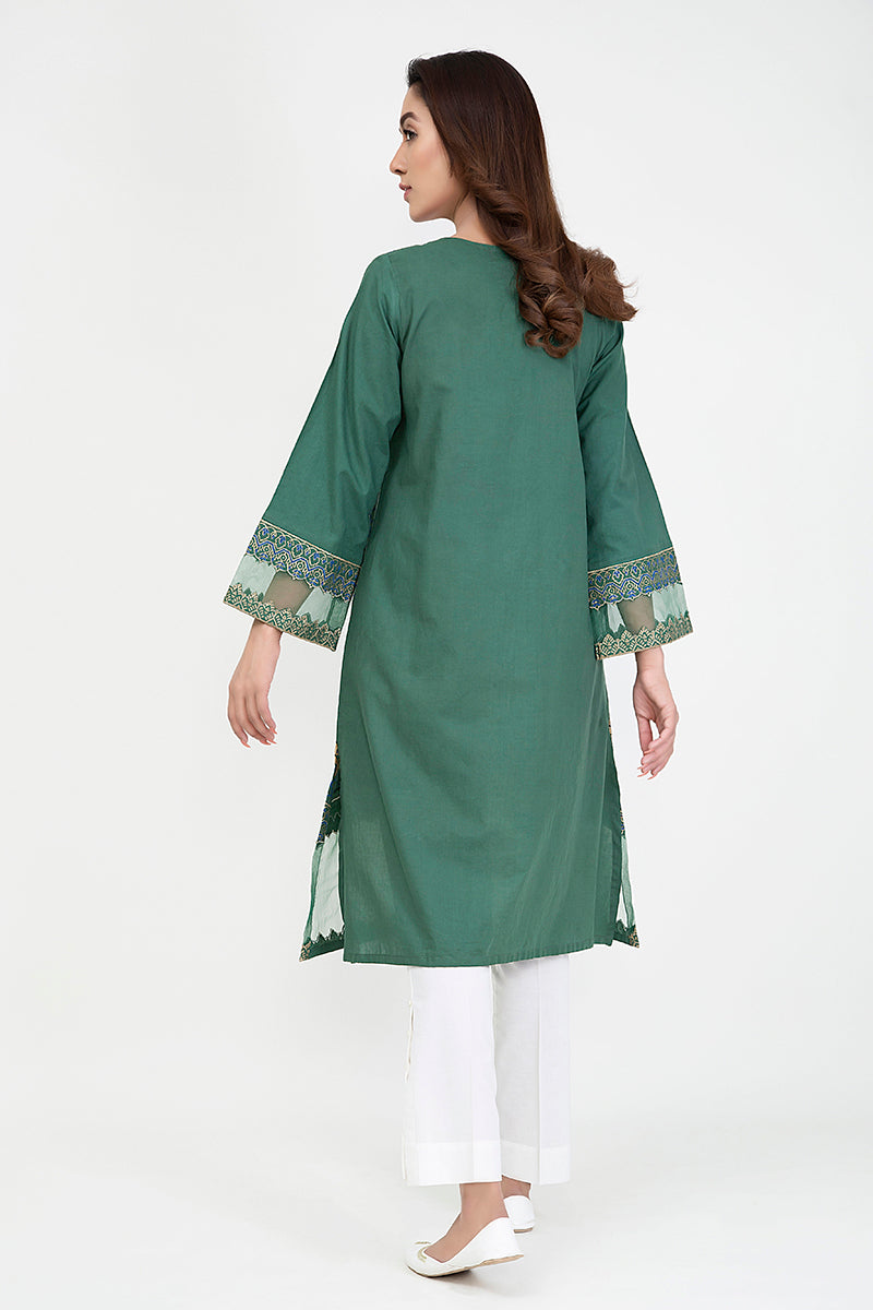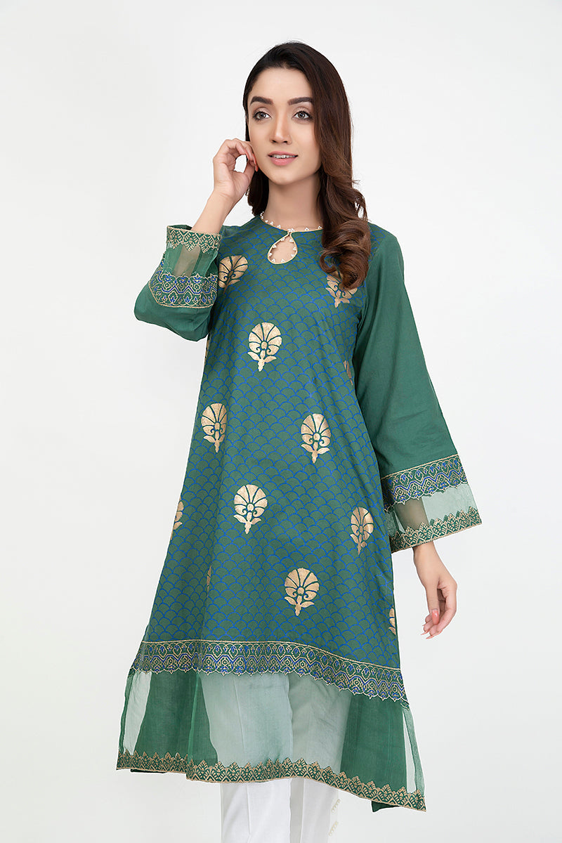Block print with organza detailing is a getaway from the daily monotony. Golds in this kurta make a statement of not perfecting the look with light colored bottoms.