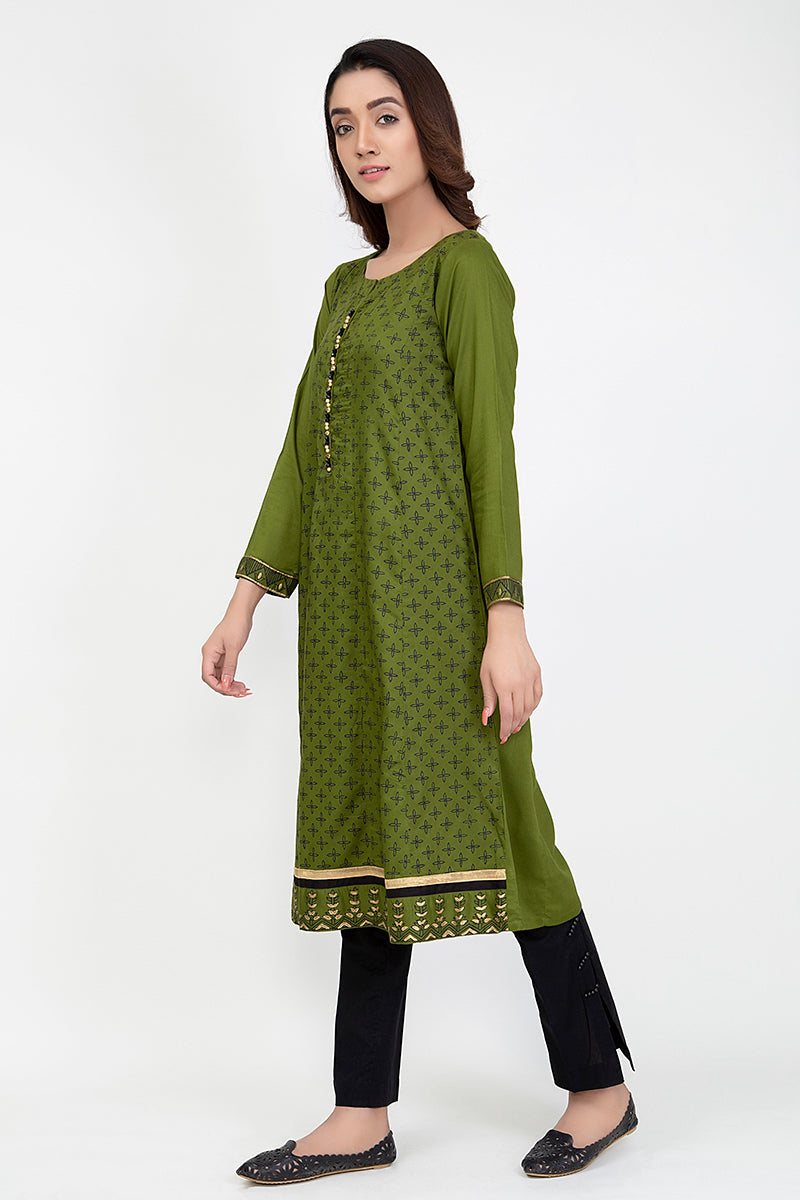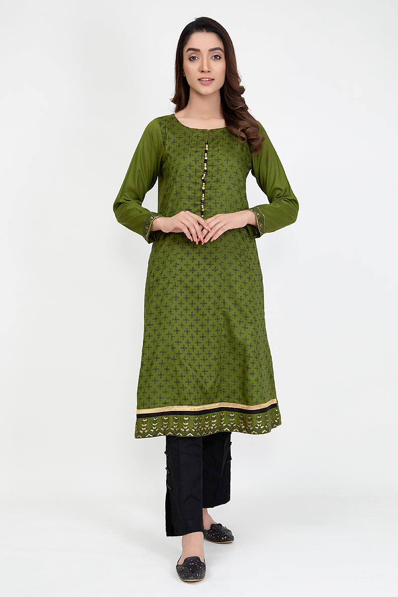 VERDANT SWARD is a lively tale to unfold. The shades of green in this kurta go playfully with a black bottom and pumps to go.