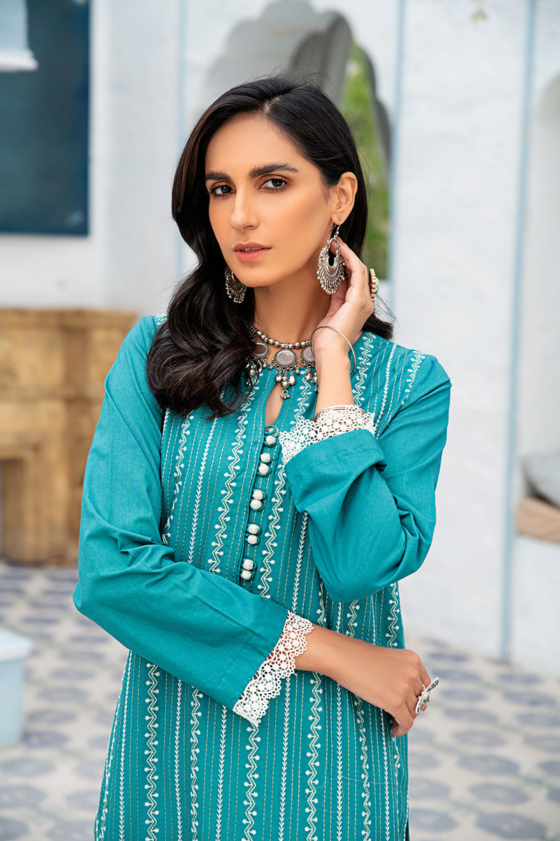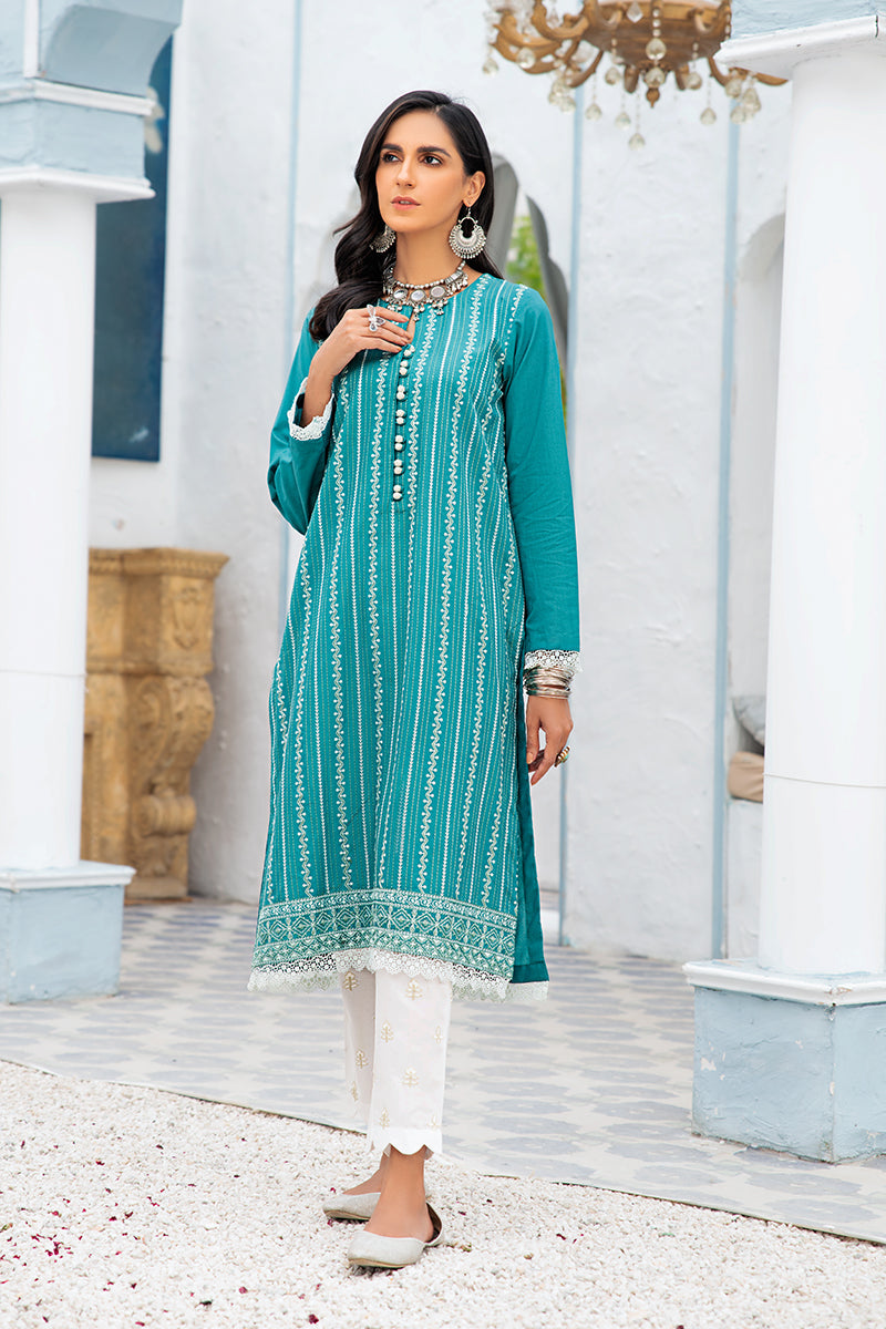 Embroidered Front, Round Neck with Slit and Button, Full Sleeves, Lace Detail on Cuff and Hem