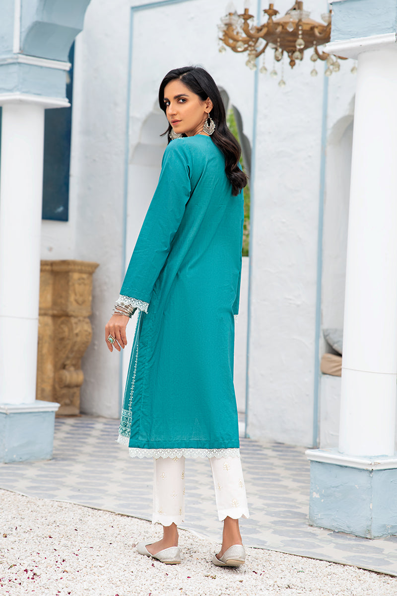 The Soothing Shade of Pine Green Serves as the Base for this Radiant Kurta with Elaborate White Thread Embroidery. Pair up this Cool toned Kurta with White Embroidered Bottom