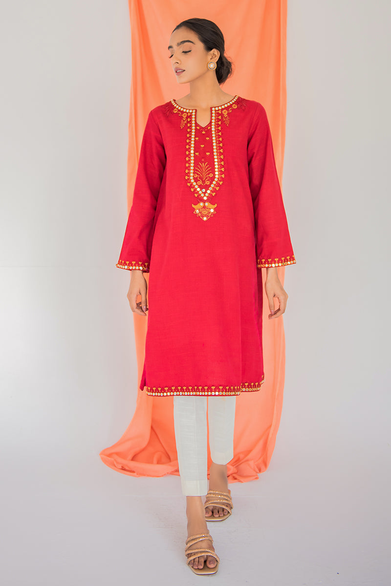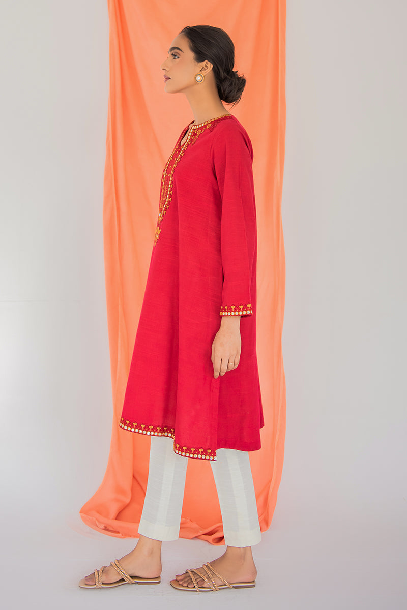 - This simply embellished A-line kurta in a bright red color would look perfect with an offwhite shalwar and khussas to adorn on any day to stand out.