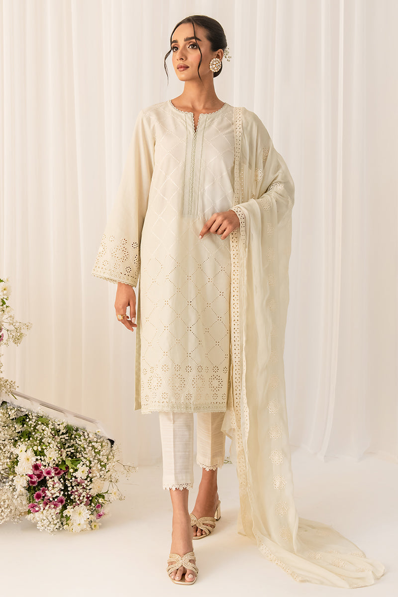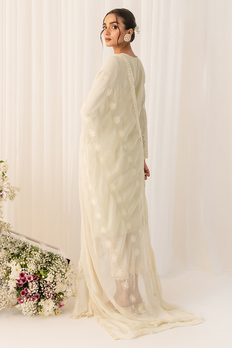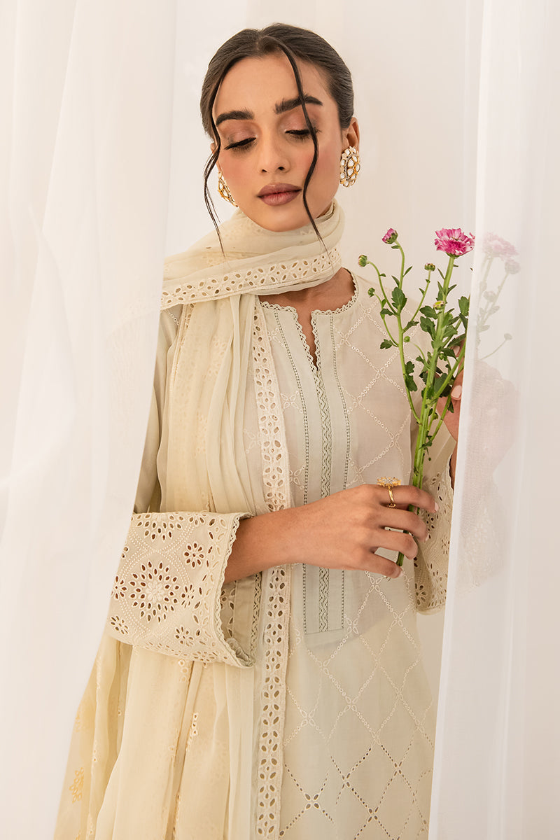 This Water Lilly straight shirt is crafted from soft and breathable cambric fabric for comfort. The front has beautiful embroidery plus lace detail on the hem. The back is plain dyed and the neckline has a round neck with a V-slit and lace detail. The sleeves are also finished with embroidered and lace detail with a crinkle chiffon dupatta. A perfect choice for all occasions.