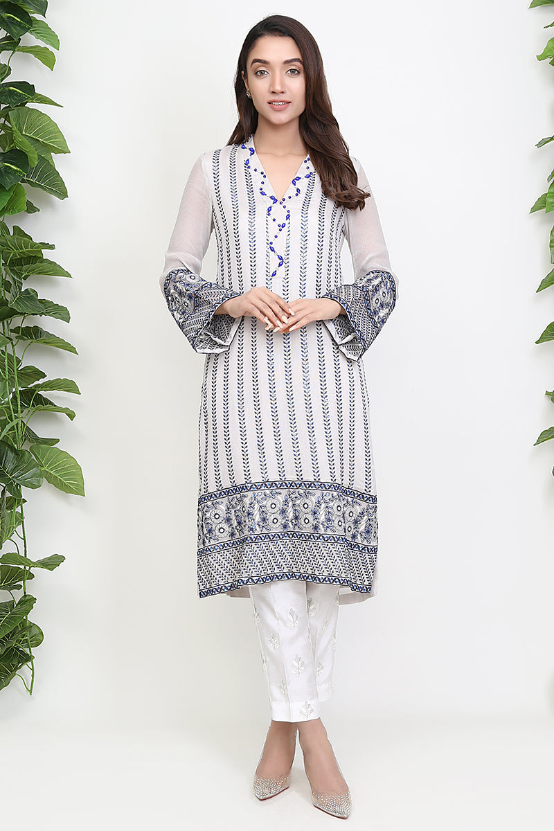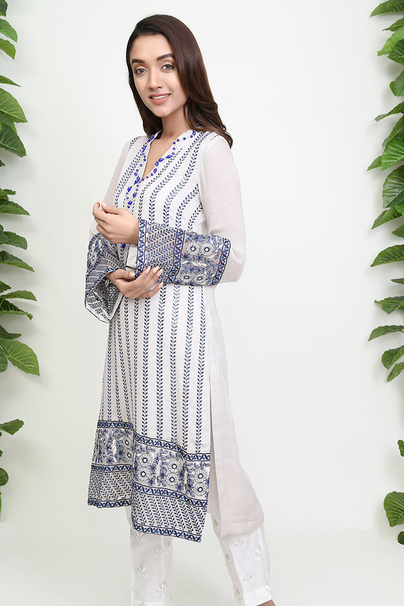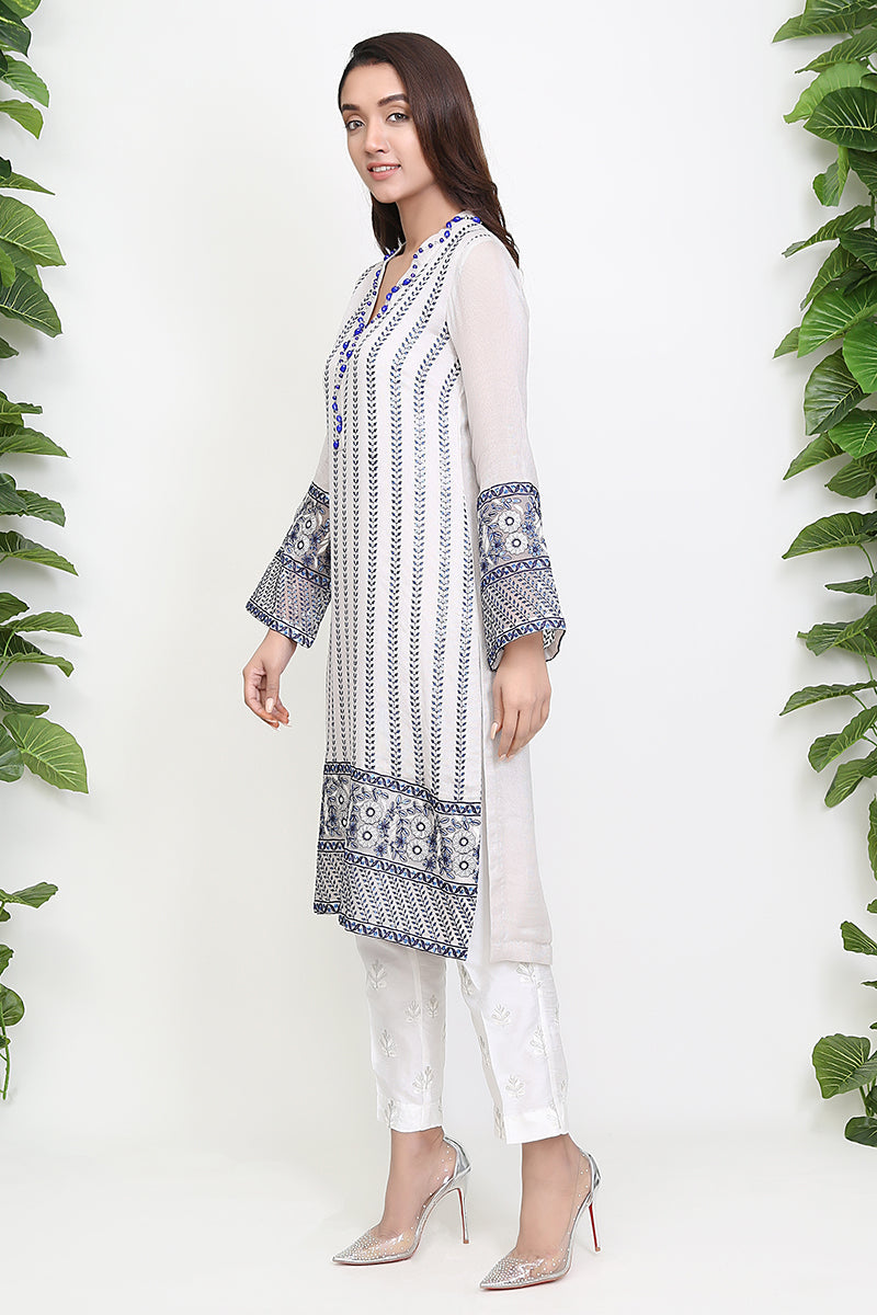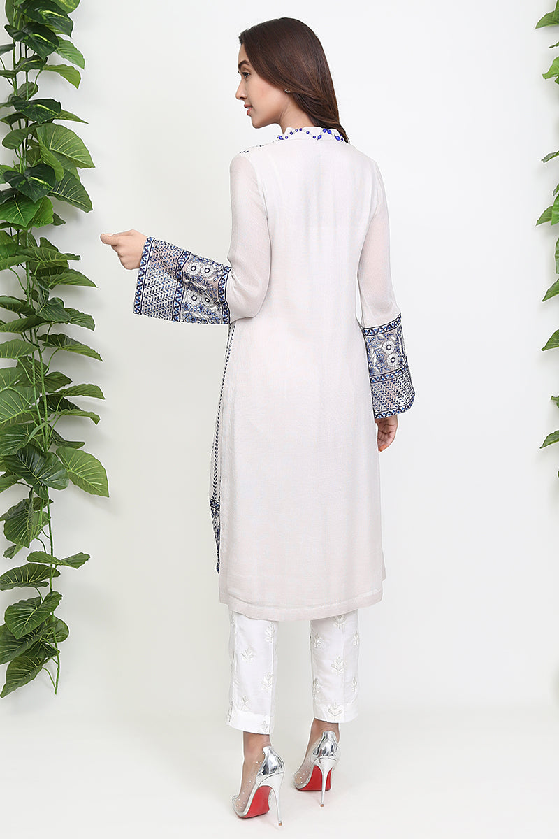 White has never been more astonishing. Topped with blue embellish, the elegance in this one lies with its border and sleeves to match with a white straight trouser.