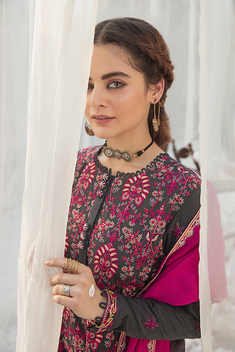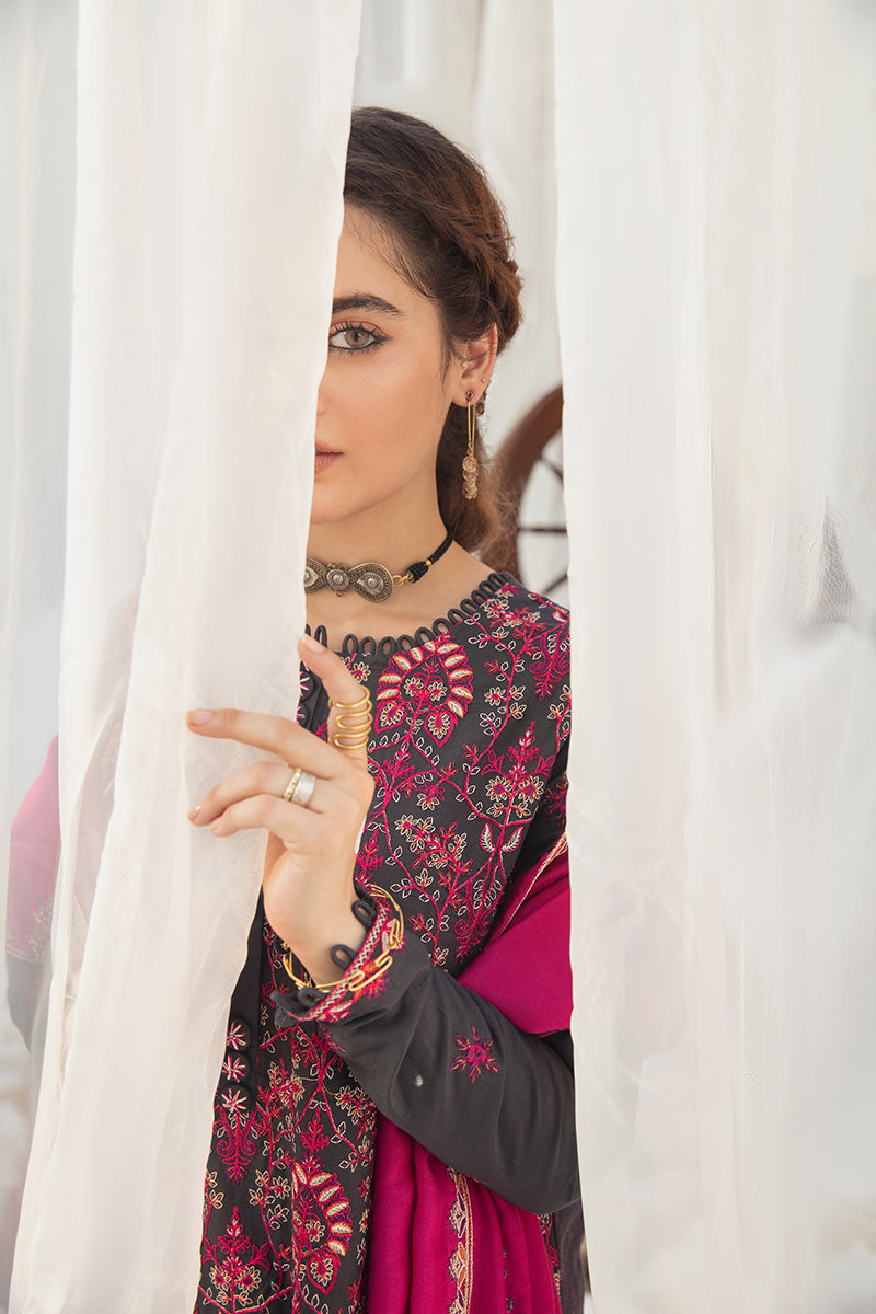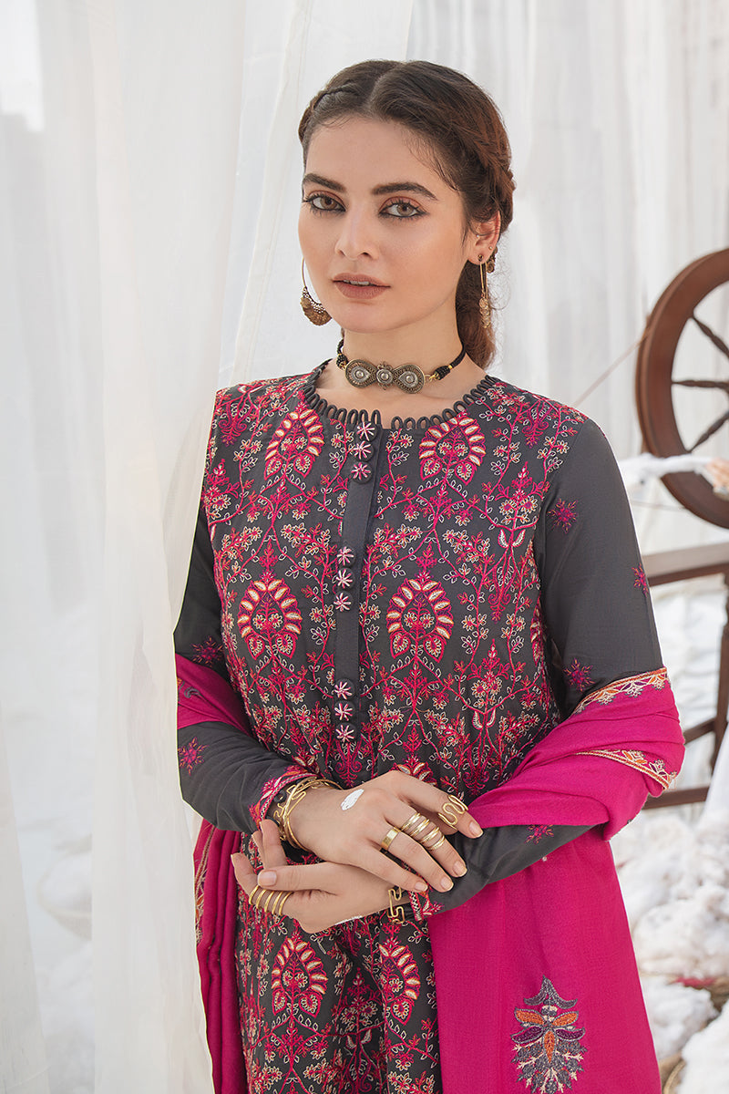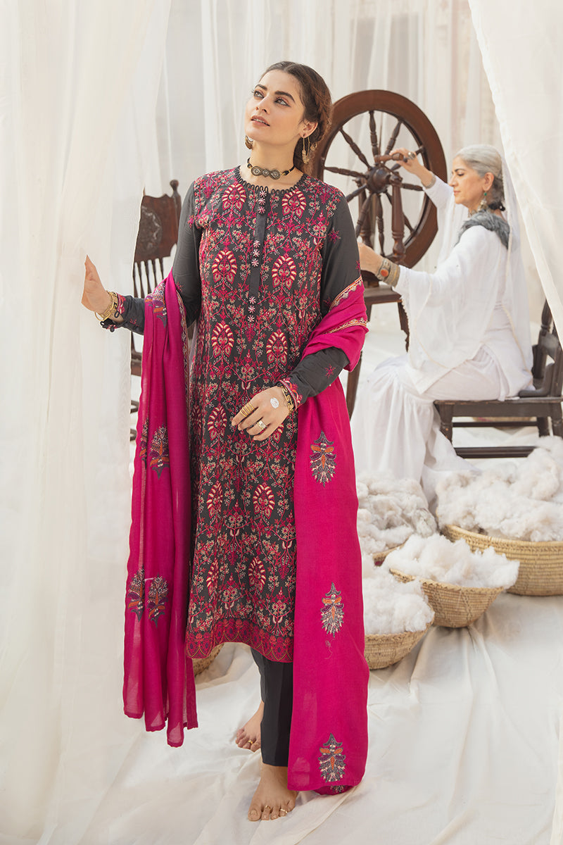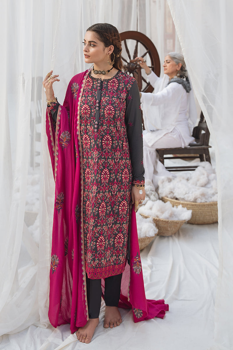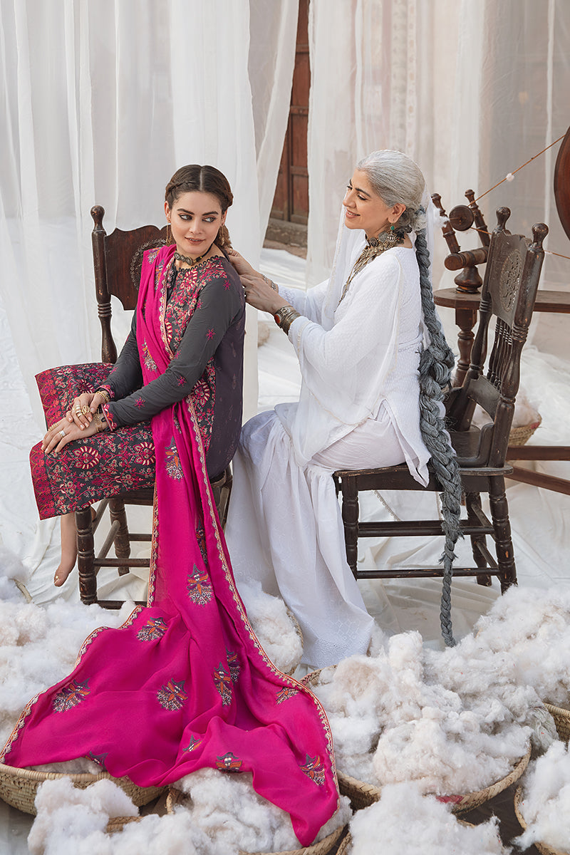 THIS STUNNING GREY AND MAGENTA COLOR DUO IS ILLUSTRATED WITH FULLY EMBROIDERED PATTERNS ON THE SHIRT- PAIRED WITH A STRIKING CONTRASTED VISCOSE NET DUPATTA!