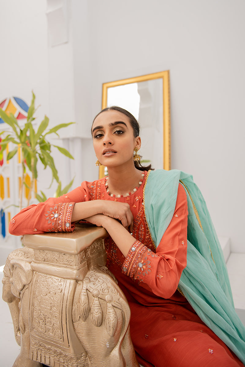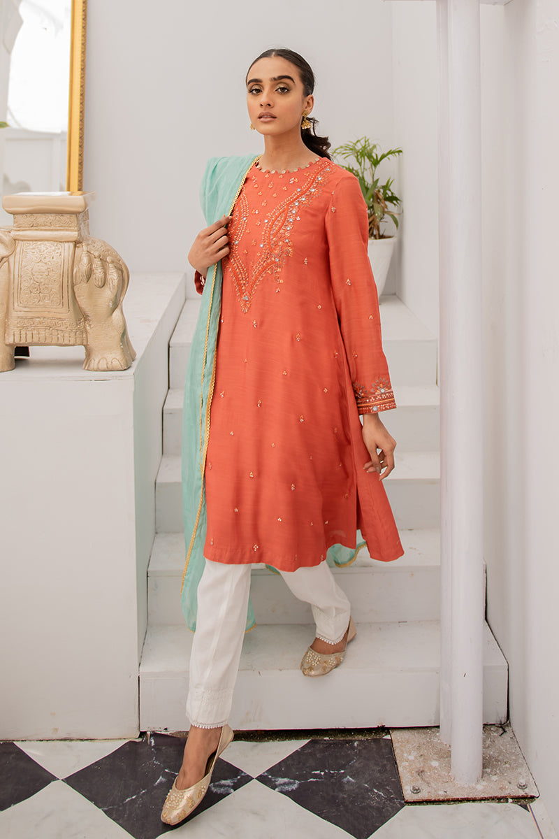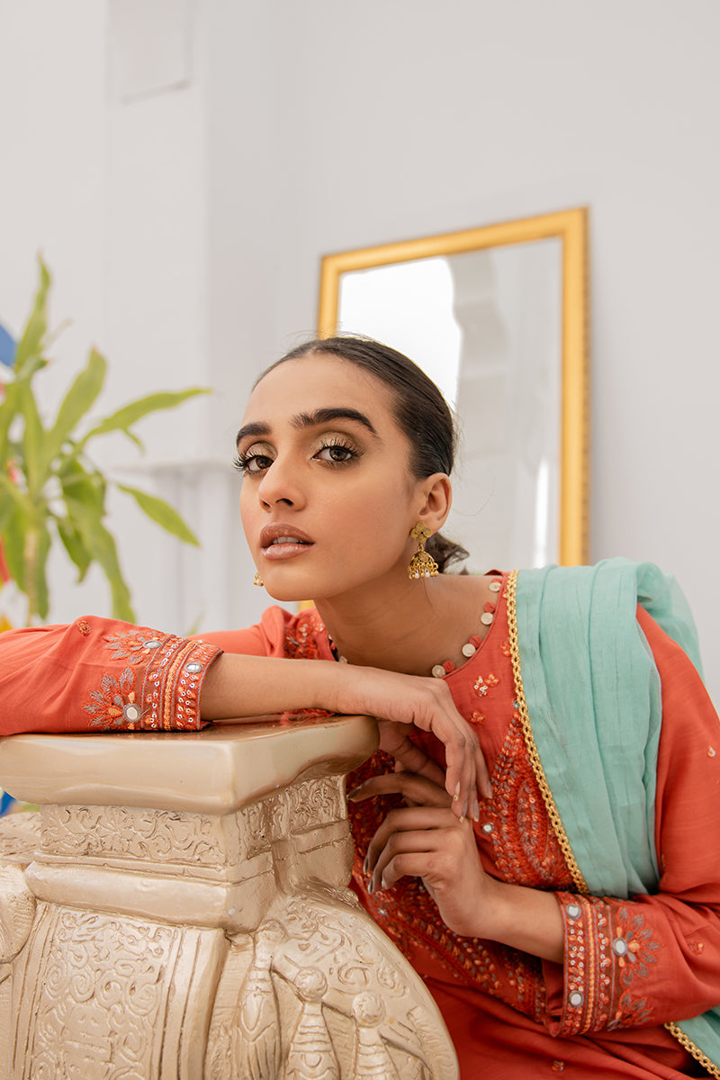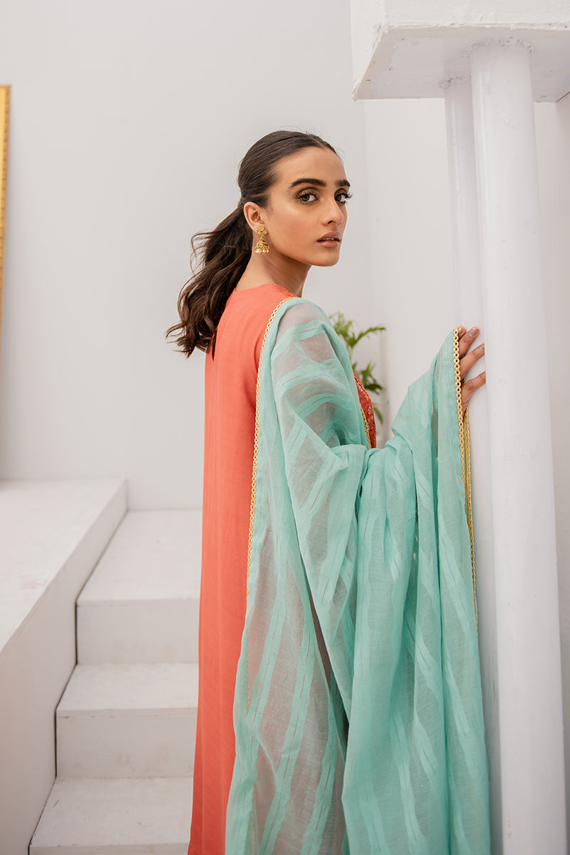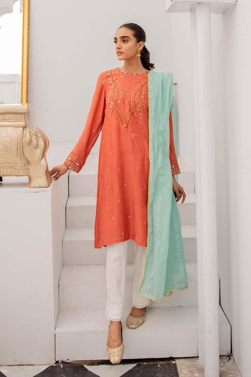 - Paired with a contrasting jacquard dupatta with tilla lace, Zarqa is a graceful two-piece featuring a hand embellished round neck, faux mirror embroidered sleeves and sequin embroidered front. Crafted on breathable summer silk, this exclusive pret can be styled with sleek ponytail and solid trousers.